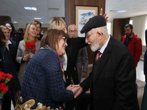Günün anısına pasta kesen Başkan Fatma Şahin, yaşlılara kırmızı gül verdi.