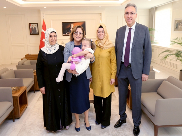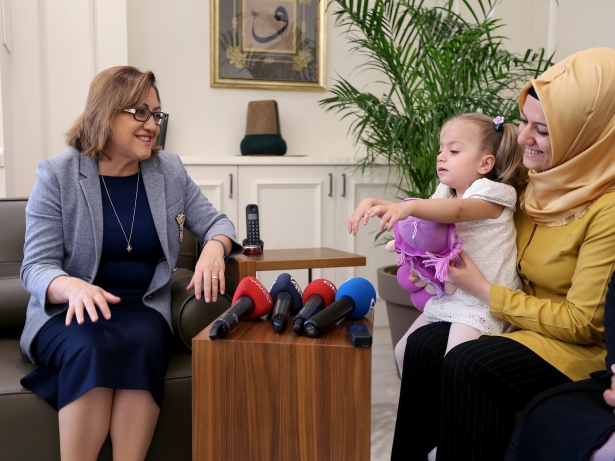 Daha 1 yaşında hidrosefali hastalığına yakalanan Fatma Eflin’in akranları gibi yürümesi için sosyal medya aracılığıyla yardım isteyen anne Tuğba Işıklı’yı makamında kabul eden Başkan Şahin, kapıda karşıladığı Eflin’e bebek verdi.