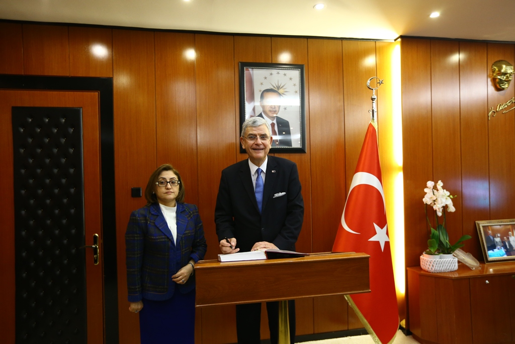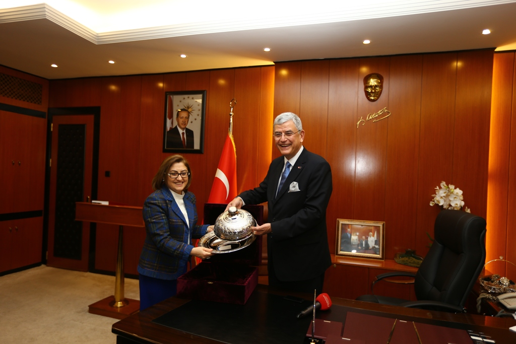 Ziyaret sonrası Başkan Şahin, Bakan Bozkır’a Gaziantep’e özgü bakır işlemeli pilvalık hediye etti.