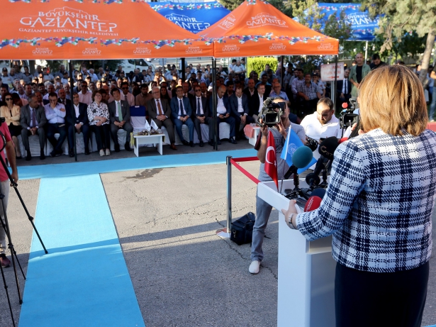 Törende konuşan Büyükşehir Belediye Başkanı Fatma Şahin, BM ve Japonya'ya duyarlılıkları ve yardımlarından dolayı teşekkür etti.