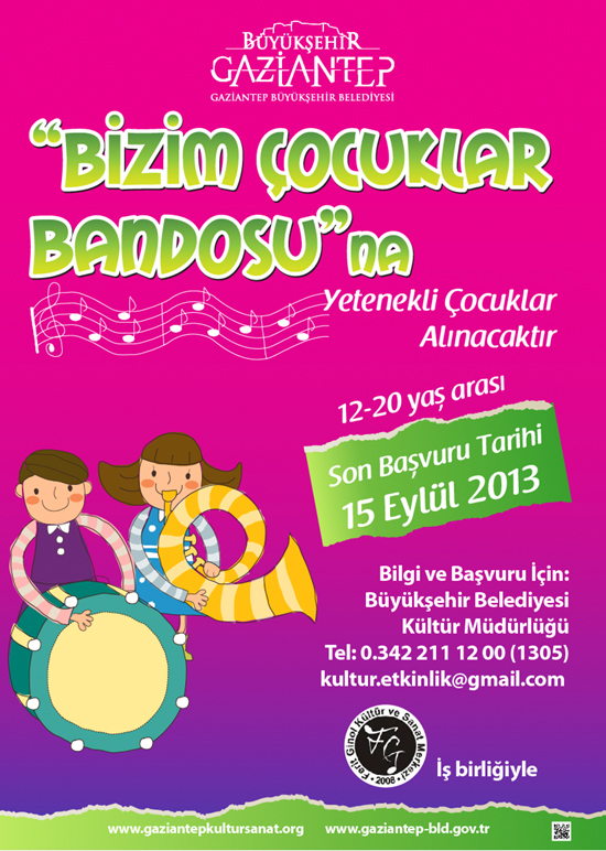 Gaziantep Büyükşehir Belediyesi Kültür ve Sosyal İşler Daire Başkanlığı Kültür Müdürlüğünün, Ferit Ginol Kültür Sanat Merkezi işbirliği ile gerçekleştireceği “Bizim Çocuklar Bandosu”na 12–20 yaş arasındaki çocuk ve gençler başvurabiliyor.