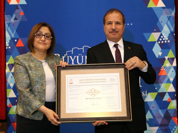 Programda, Korkmaz, Şahin’e “TS EN ISO 9001:2008 Kalite Yönetim Sistemi Belgesi” ve TSE-ISO-EN 9000 yazılı bayrağı takdim etti. Ayrıca, Korkmaz ve Şahin, törende birbirlerine hediye verdi.