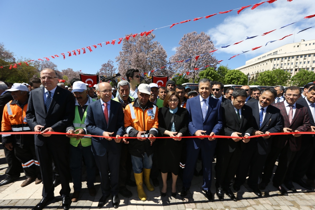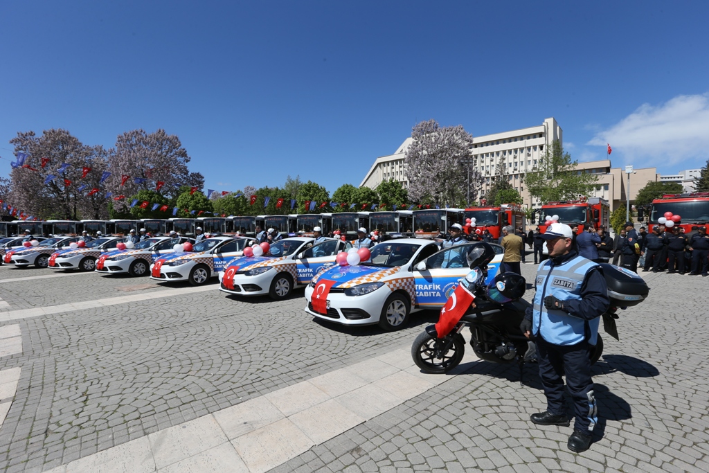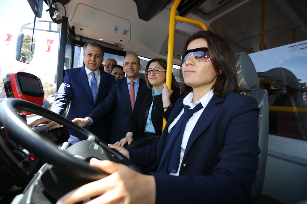 Konuşmaların ardından protokol, 14 otobüs, 5 itfaiye, 13 trafik zabıtası, 30 ilaçlama ve 3 iş makinası olmak üzere toplamda 65 aracın hizmete giriş kurdelesini kesti. Ardından hizmete alınan otobüslerden birine binen Şahin, Şimşek ve beraberindekiler, bayan şoförden, araç hakkında bilgi aldı.
