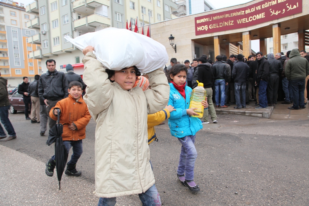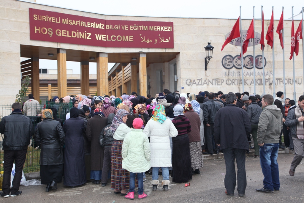 Kendi imkânları ile Gaziantep’e gelen, kiralık evlerde ve yakınlarının yanında kalan Suriyeli vatandaşlar Gaziantep Büyükşehir Belediyesi’ne bağlı Suriye Bilgi Merkezi’nde kendilerini yapılan gıda yardımını aldılar.