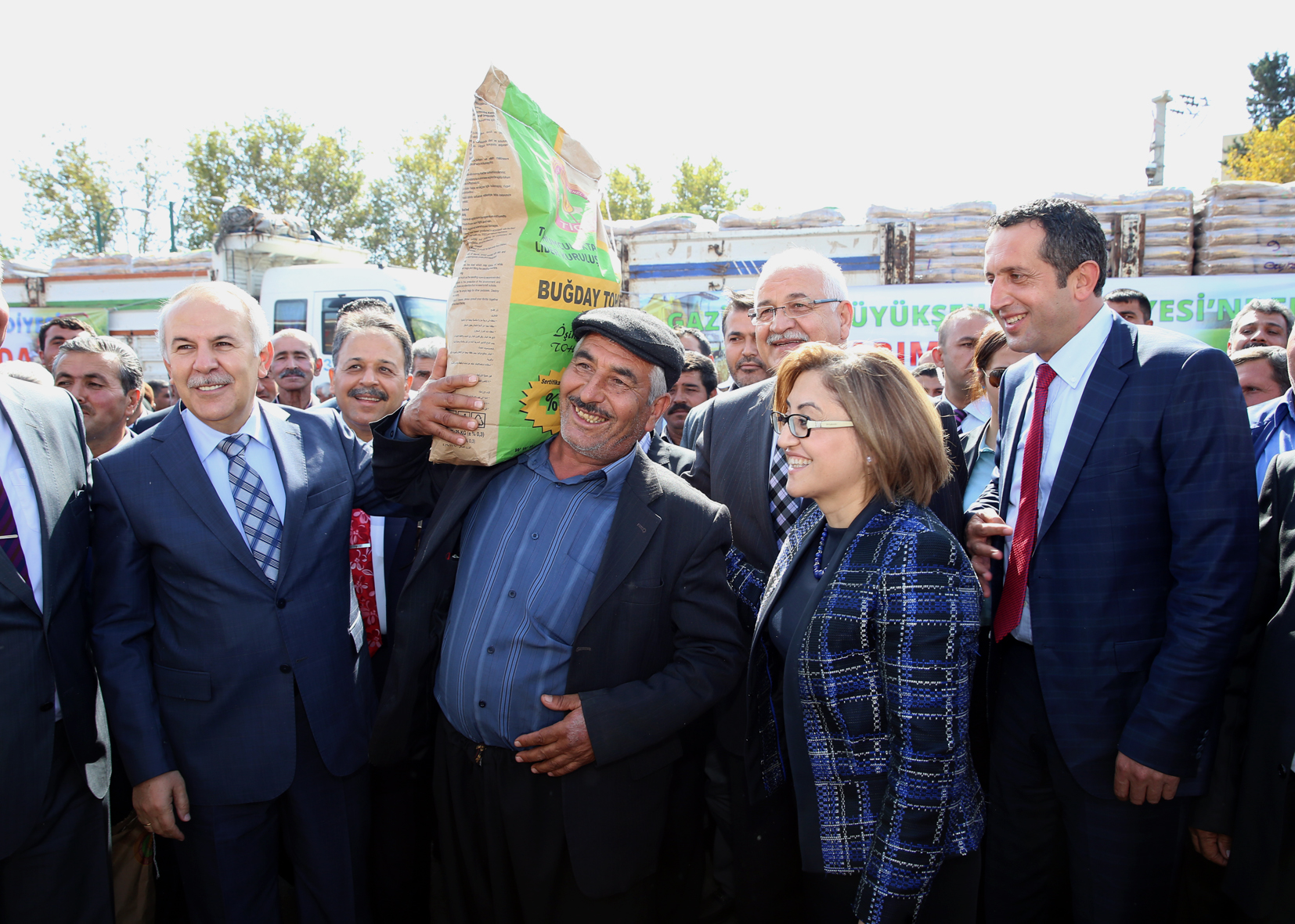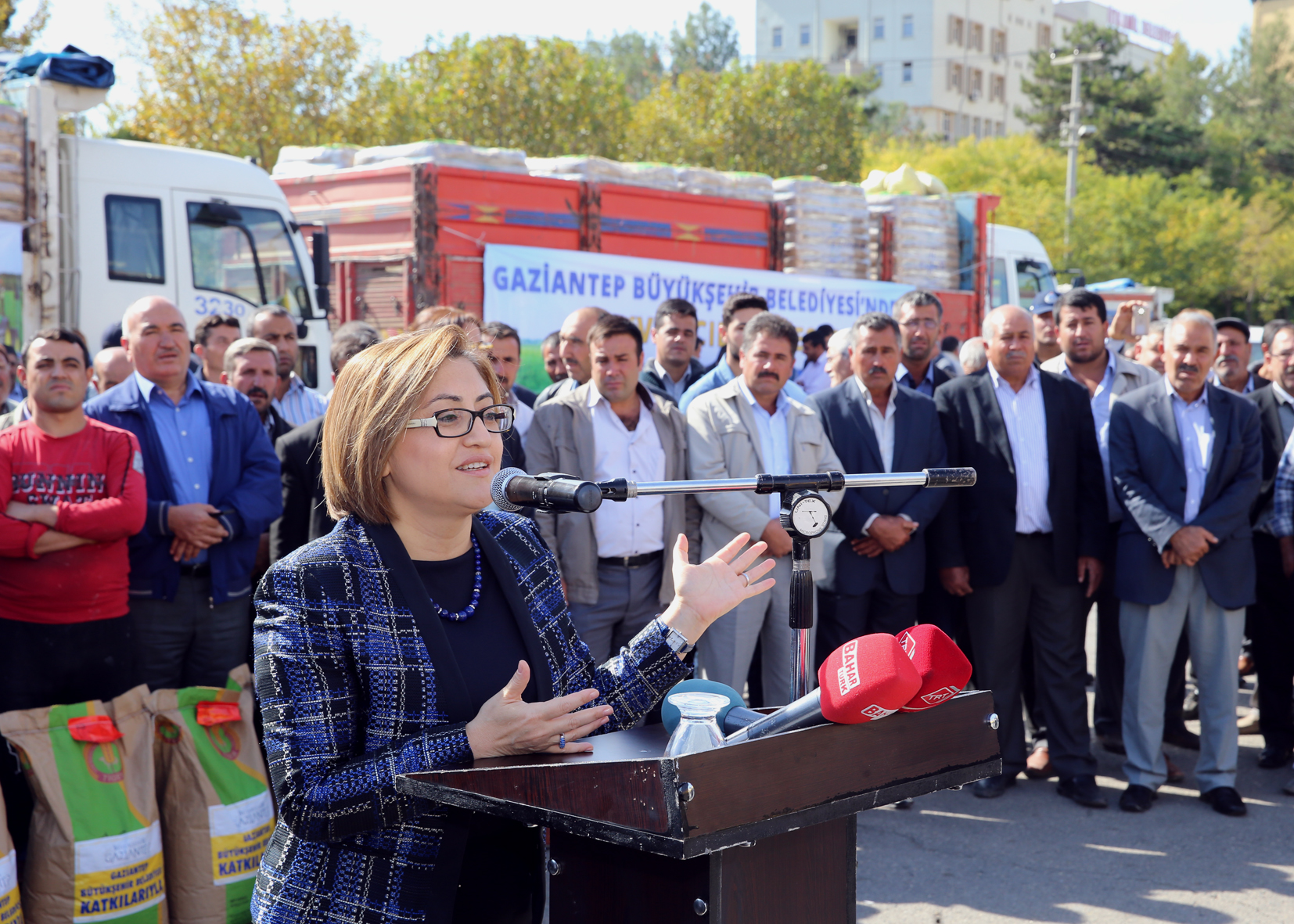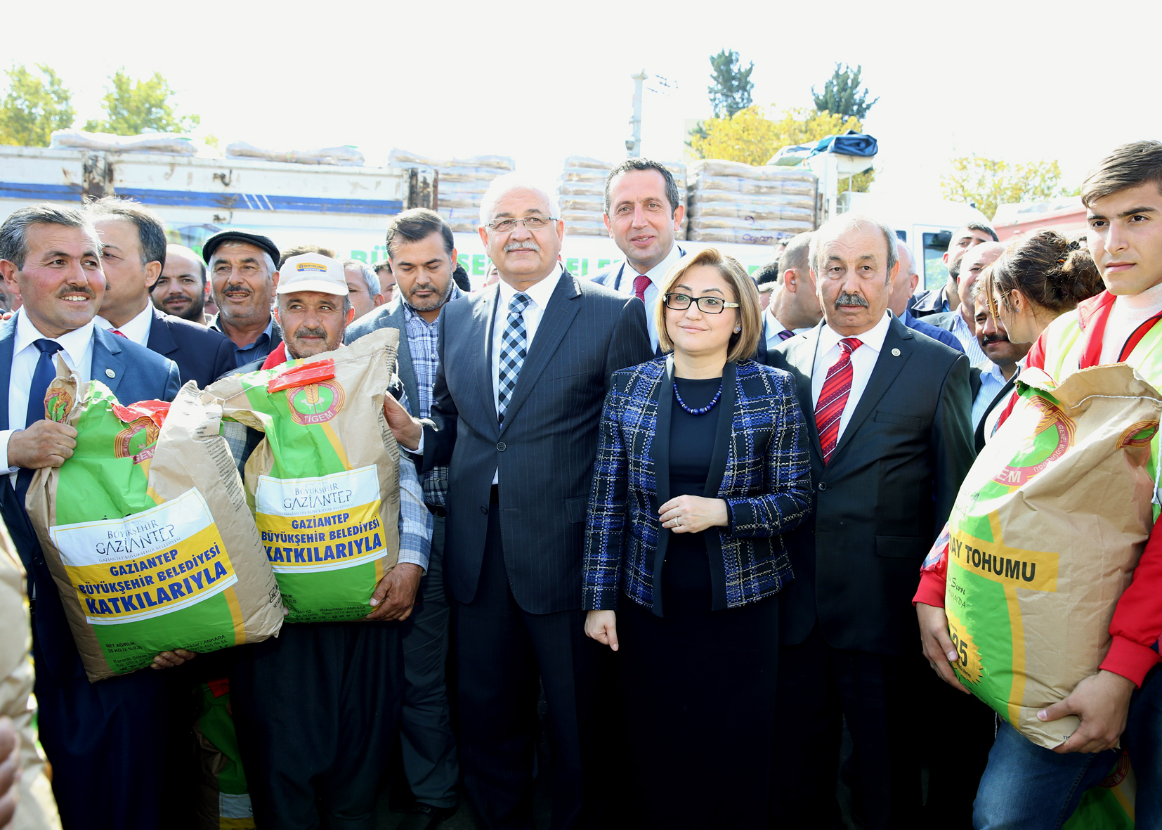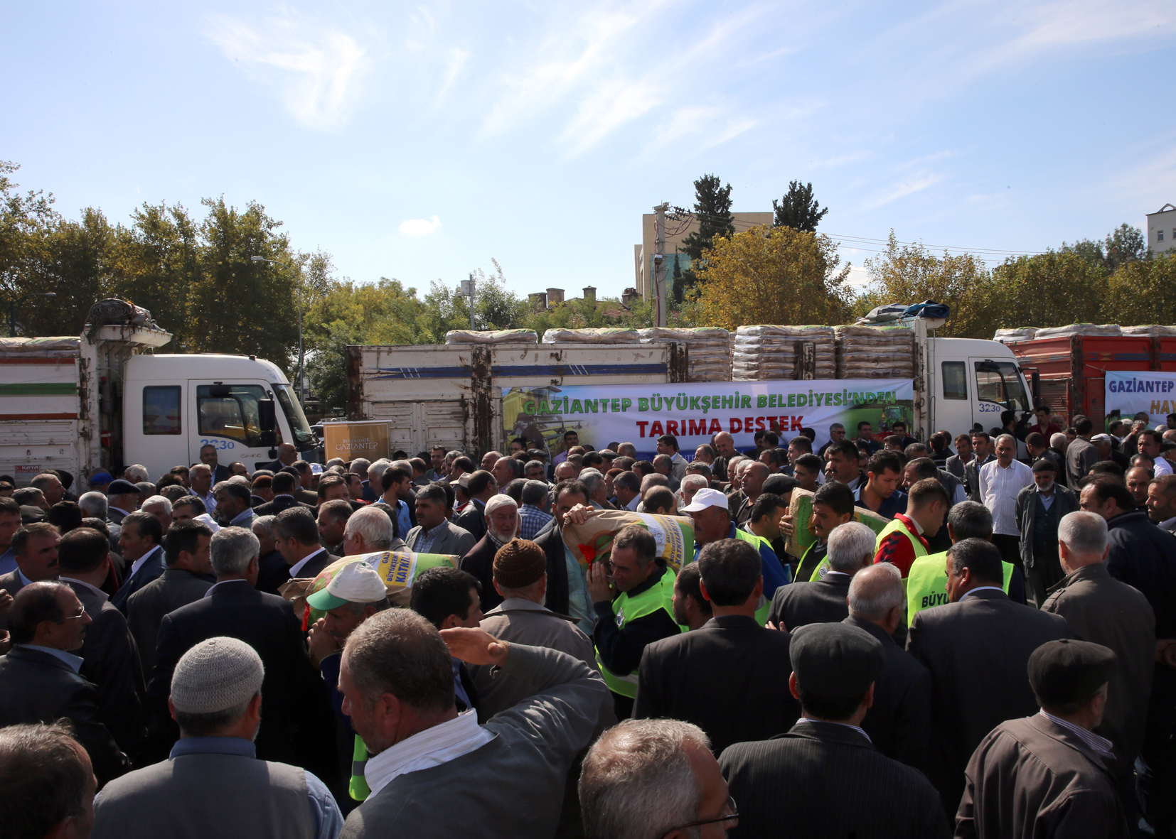 Gaziantep Büyükşehir Belediyesi tarafından Türkiye’de ilk kez yapılan uygulamada yüzde 50 çiftçi katkısıyla bin 570 ton buğday, yüzde 20 çiftçi katkısı ile bin torba silajlık mısır ve 100 ton fiğ tohumu düzenlenen törenle 3 bin 600 çiftçiye dağıtıldı.