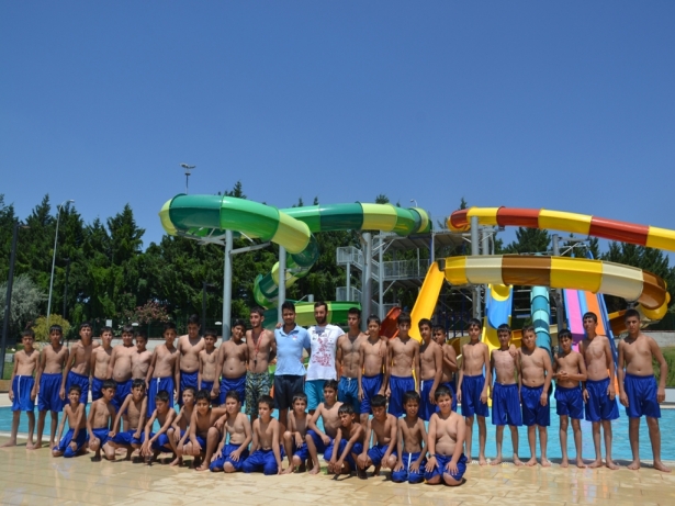 Özellikle dezavantajlı bölgelerden özel araçlarla taşıma hizmeti verilen çocuklar, bir yandan yüzme öğrenirken bir yandan da yazın bu sıcak günlerinde havuz keyfi yapıyor.