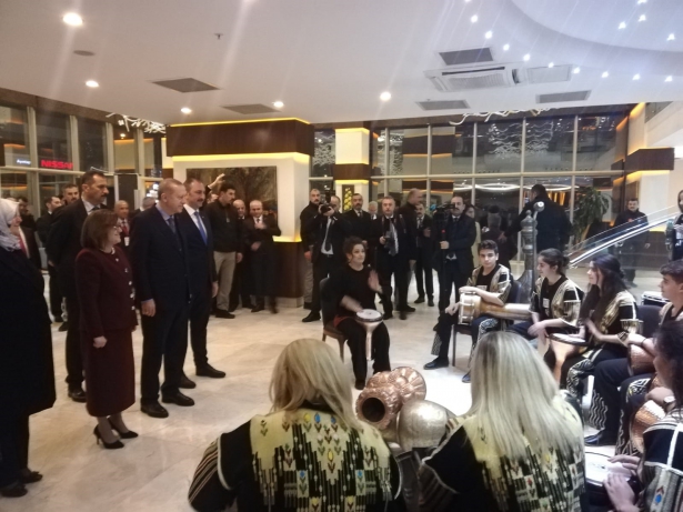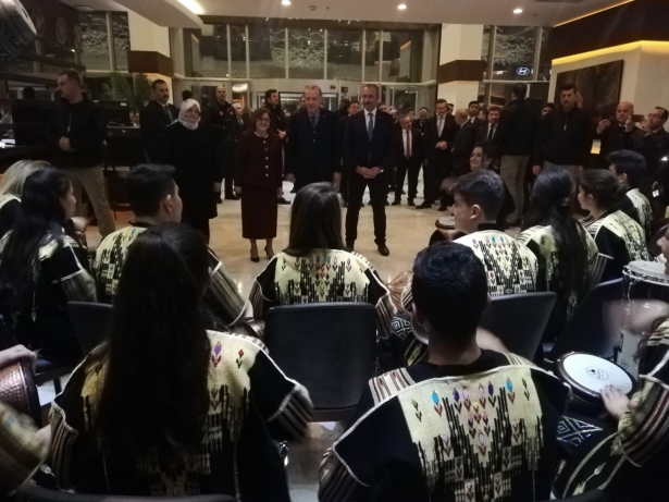 AK Parti Gaziantep Adayları Tanıtım Toplantısı’na katılmak üzere Gaziantep’e gelen AK Parti Genel Başkanı ve Cumhurbaşkanı Recep Tayyip Erdoğan, büyük bir sürprizle karşılaştı. Bu yıl, Gaziantep Bakırcılar ve Sedefçiler Odası’nın yetiştirdiği kadın ustalarının da aralarında bulunduğu Büyükşehir Belediyesi Çocuk ve Gençlik Ritim Grubu, cumhurbaşkanına özel bir gösteri sundu. Gösteri karşısında etkilenen Cumhurbaşkanı Erdoğan, gösteriyi ilgiyle izledi. Cumhurbaşkanı, gösteri sonunda gençlerle ve eğitmenlerle sohbet etti, grubu Ankara’da performanslarını sergilemek üzere davet etti.