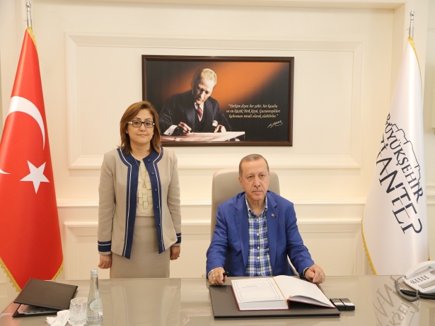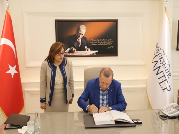 Görüşmenin sonunda şeref defterini imzalayan Erdoğan’a Şahin, hediye takdim etti.