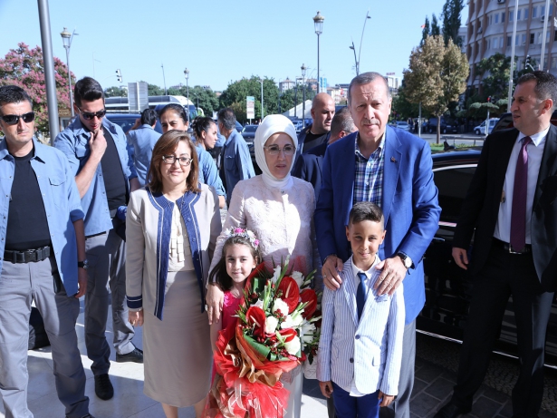 Cumhurbaşkanı Erdoğan'ı Gaziantep Büyükşehir Belediye Başkanı Fatma Şahin ve bir grup çocuk karşıladı.