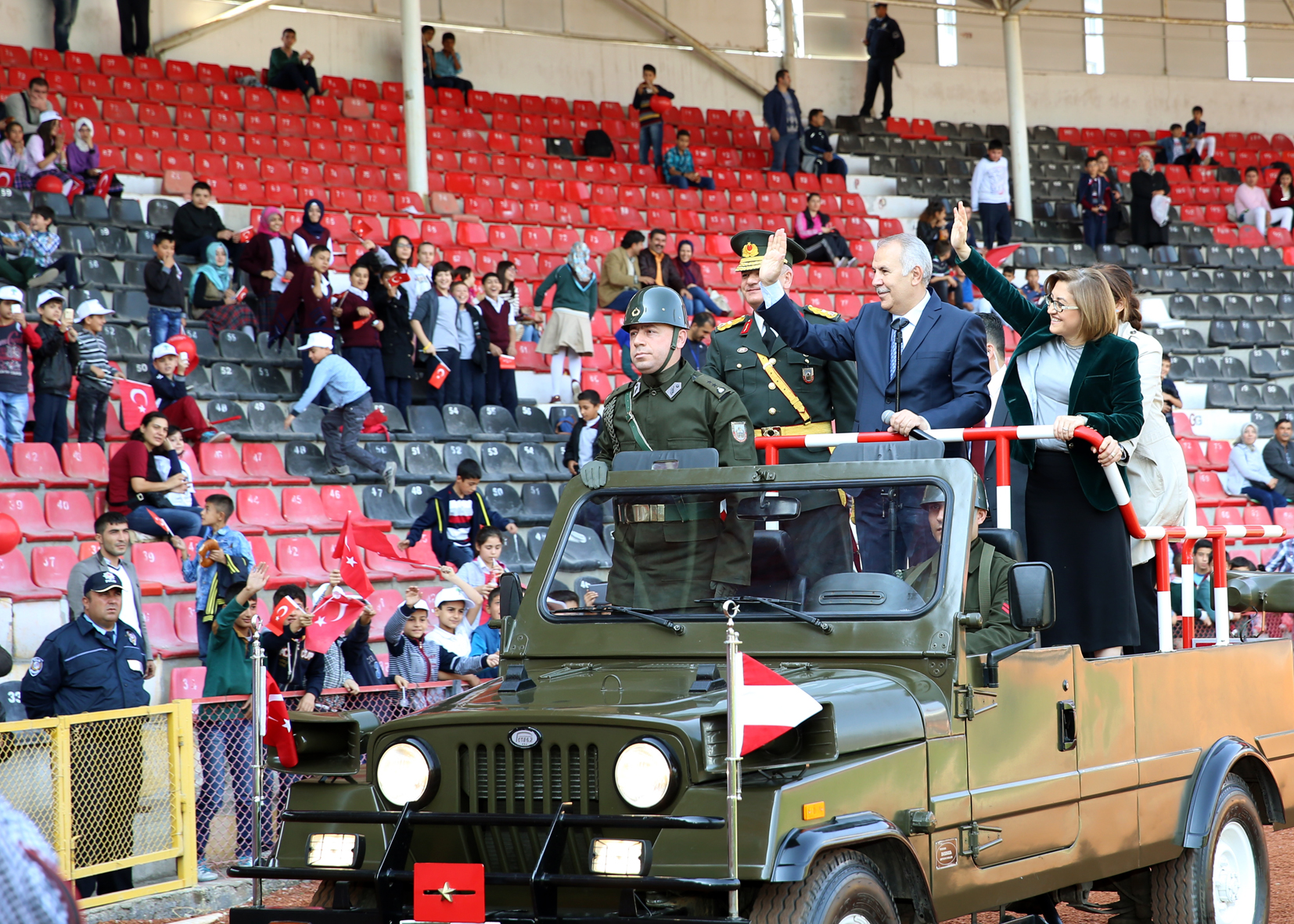 Kutlamalar daha sonra Kamil Ocak Stadyumu’nda devam etti. Burada Vali Erdal Ata, 5. Zırhlı Tugay Komutanı Tuğgeneral Cemalettin Doğan ve Gaziantep Büyükşehir Belediye Başkanı Fatma Şahin vatandaşların bayramını kutladı.
