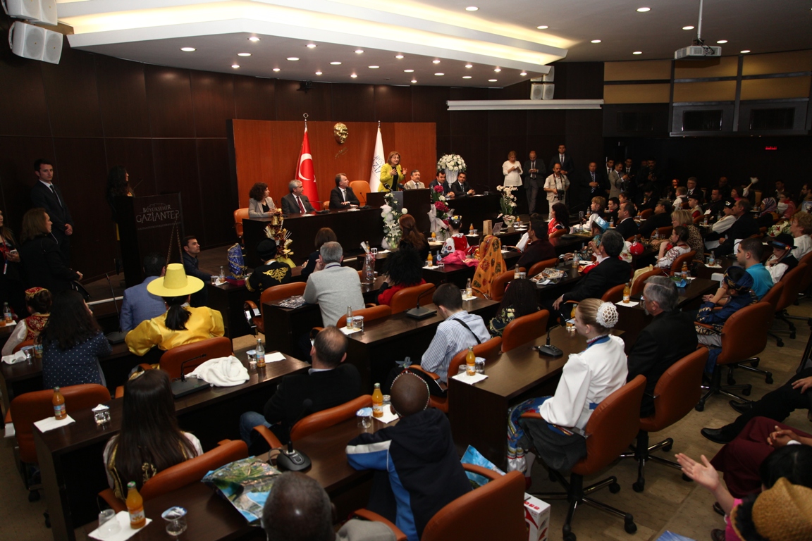 Ülkelerine ait yöresel kıyafetleri ile Büyükşehir Belediyesi Meclis Salonu’nu dolduran çocukları Türkiye’de ve Gaziantep’te görmekten duydukları mutluluğu dile getiren Gaziantep Büyükşehir Belediye Başkanı Fatma Şahin, Gaziantep’in binlerce yıl birçok medeniyete ev sahipliği yapmış, bir barış, kardeşlik ve hoşgörü şehri olduğunu belirtti.