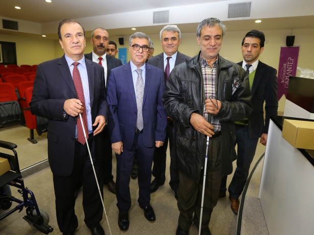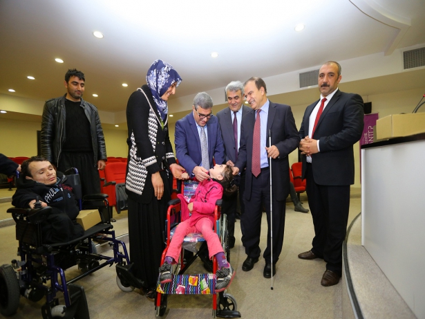 Konuşmaların ardından Yetkinşekerci ile Çelebi, engellilere, tekerlekli sandalye, sesli saat ve beyaz baston dağıttı.
