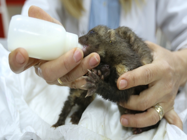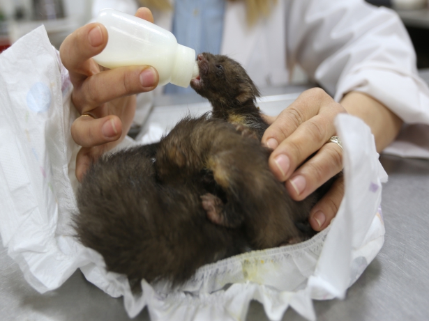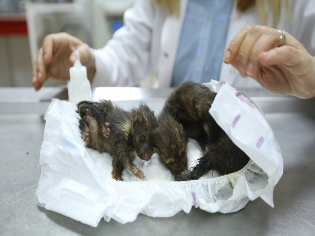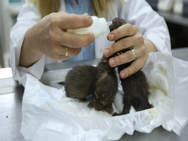 Henüz 15 günlük olan 3 yavru Sansar’ı süt ile besleyen hayvanat bahçesi görevlileri, yavruların üşümemesi için kuvöz içinde çocuk bezine sararak koruyorlar.