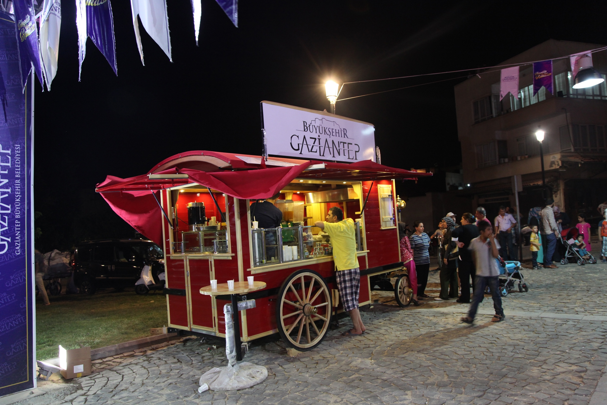 Gaziantep’e özgü süs eşyacısından kebapçısına, meyancısından tatlıcısına, el işi yapımından bakır eşyacısına bir çok ürünlerin satıldığı Ramazan Sokağı’nda, iftardan sonra Karagöz–Hacivat ile orta oyunları da sergileniyor.