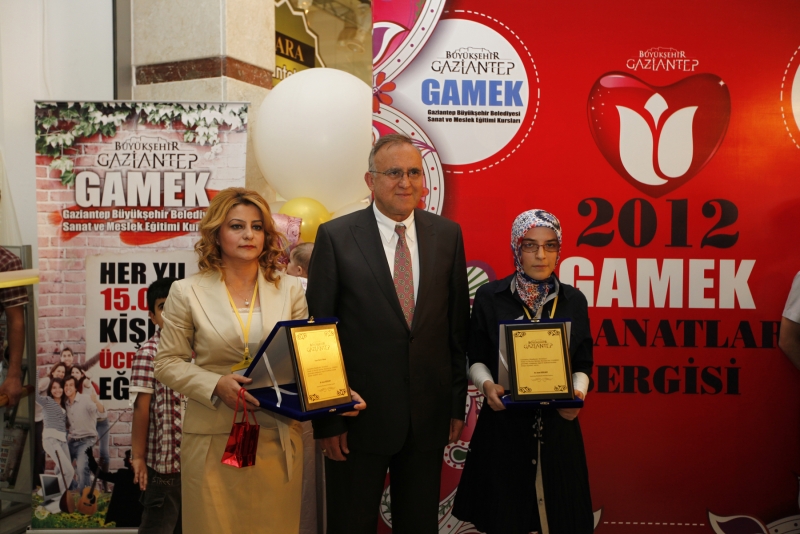 Büyükşehir Belediyesi Sanat ve Meslek Eğitimi Kursları (GAMEK) kursiyerleri tarafından hazırlanan yıl sonu sergisinin hayırlı olmasın dileyen Başkan Güzelbey, 2011-2012 eğitim öğretim yılında, Milli Eğitim Bakanlığı Hayat Boyu Öğrenme Genel Müdürlüğü ile Kaplan Tekstil ve Yapım Sanayi ve Ticaret işbirliğinde, halk eğitim merkezlerinin gözetiminde ve denetiminde kurs açan belediyeler arasında düzenlenen el nakışı yarışmasına GAMEK El Sanatları öğretmenimiz Hatice Yılmaz ile kursiyerimiz Elif Geçgil 81 ilden katılan belediyeler arasında Türkiye birinciliği kazanmışlardır. Kendilerini tebrik ediyorum ve birinciliği kazandıkları için öğretmen ve kursiyerimize 20şer gram külçe altını firma tarafından takdim edilecektir. Büyükşehir Belediye Başkanı olarak bu kursları alan değerli kursiyerlerimize ve bu eğitimleri veren eğitici arkadaşlara çok teşekkür ediyorum diye ifade etti.