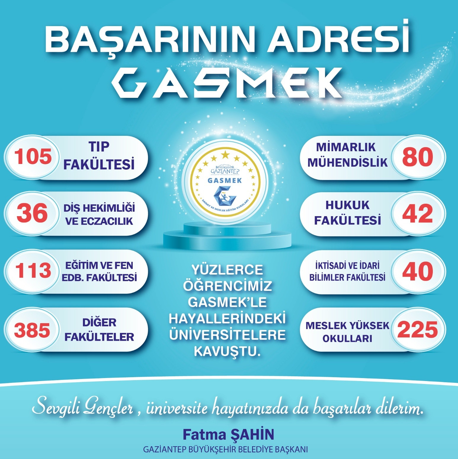 Yüzlerce öğrenci GASMEK ile hayallerindeki mesleğin eğitimini almak için hak kazanırken, Gaziantep Büyükşehir Belediye Başkanı Fatma Şahin’in hedefi haline getirdiği “Eğitim Dostu Gaziantep” için durmadan çalışan GASMEK, her yıl başarı çıtasını yükseltiyor. 2015 yılında eğitim faaliyetlerine başlayan GASMEK kursları bugüne kadar on binlerce kişinin üniversite hayallerine ulaşmasında basamak oldu.
