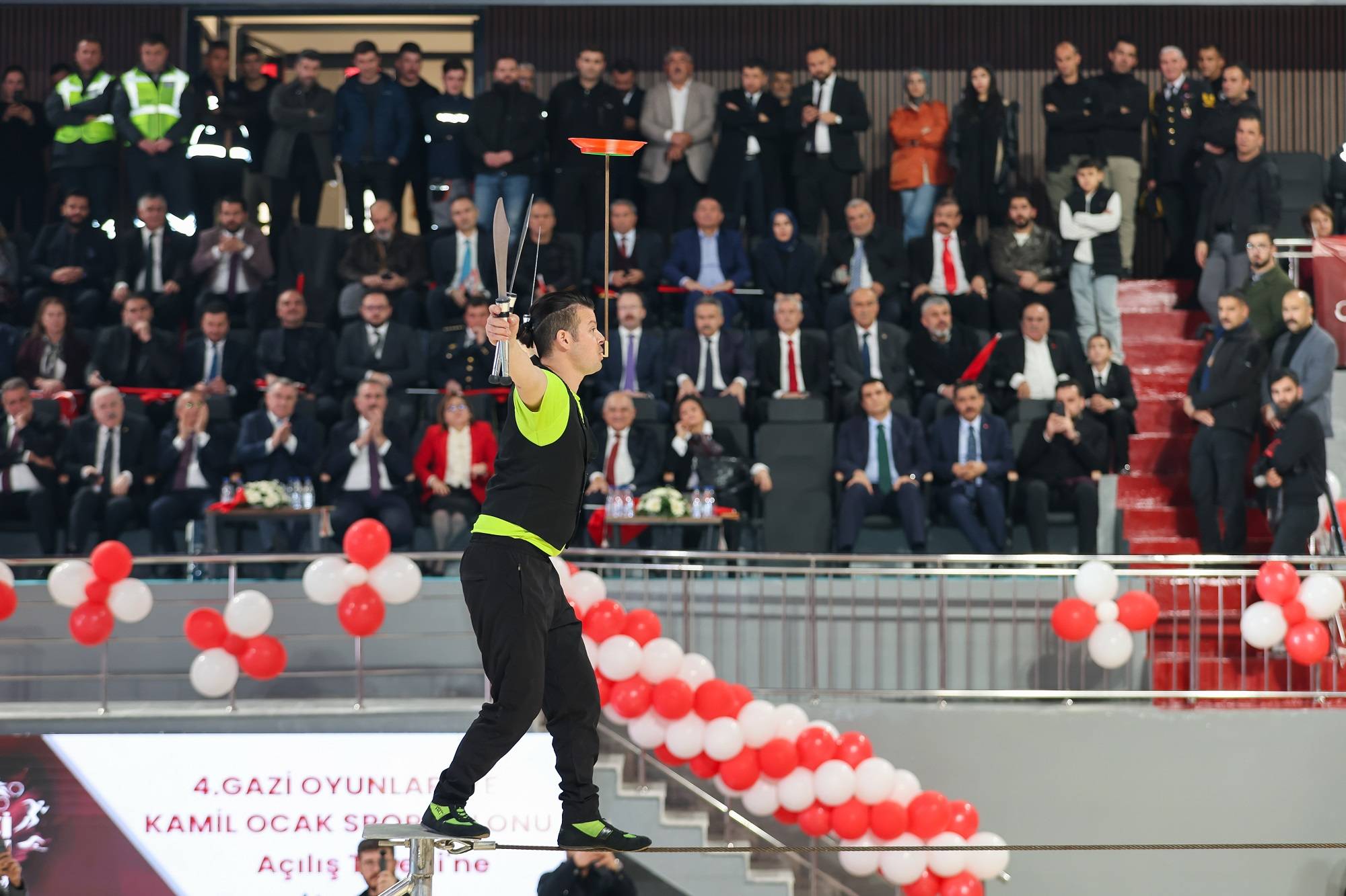 Renkli görüntülerle yapılan açılışta ayrıca akrobasi ve cambaz gösterilerinin yanı sıra basketbol gösterisi sergilendi. Programda ayrıca 81 ilden gelen öğrenciler bayraklar eşliğinde salonda yer aldı. Salonun açılışı için kurdele kesildi, yakılan meşale ile de Gazi Oyunları resmen başladı.