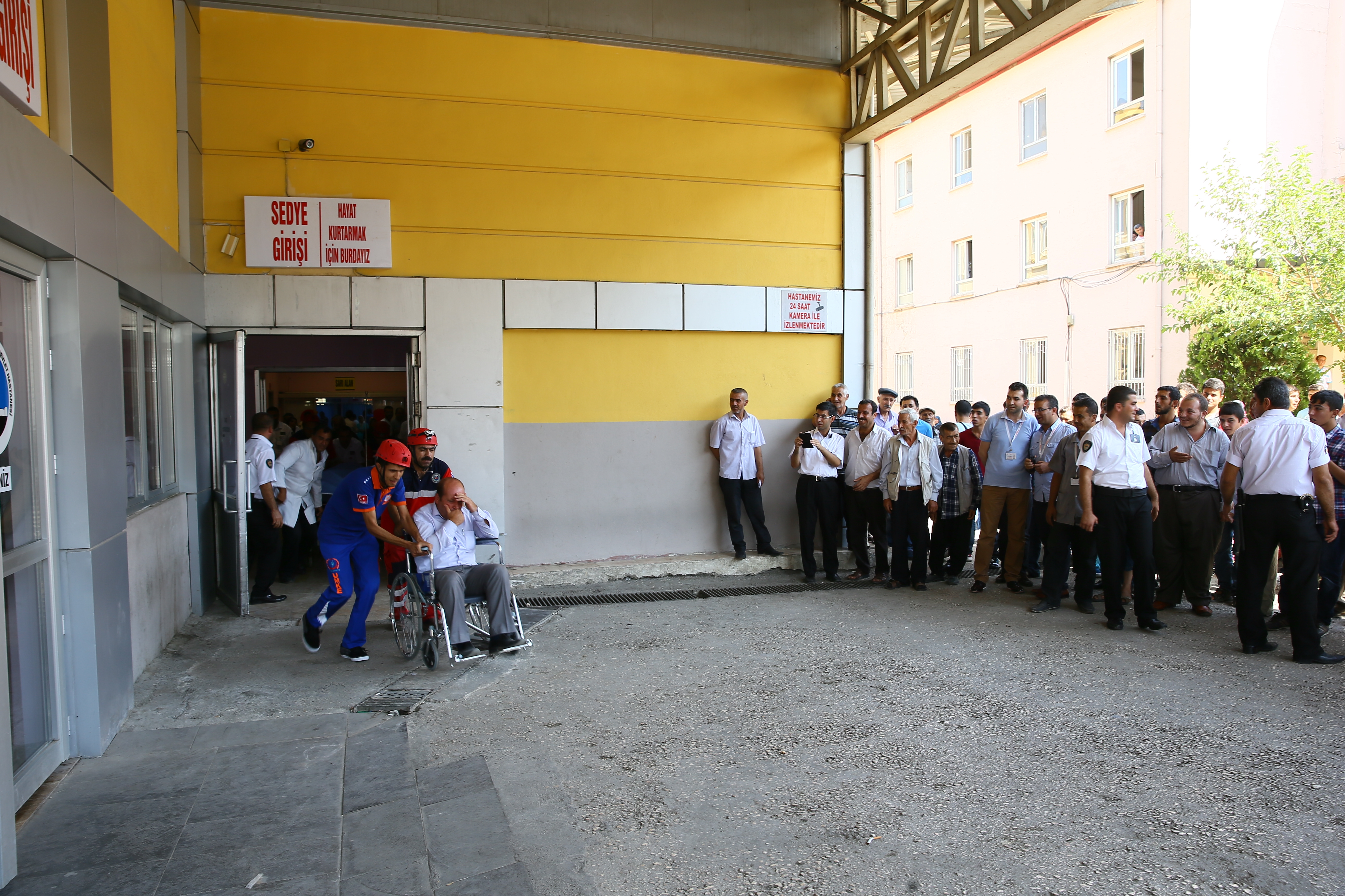Senaryo gereği sedye ve acil yardım malzemelerinin bulunduğu çantalarla binaya giren UMKE ve sağlık ekipleri, yaralıları ilk müdahalenin ardından ambulanslarla hastaneye taşıdı.