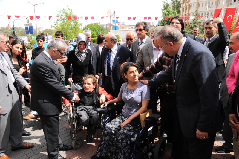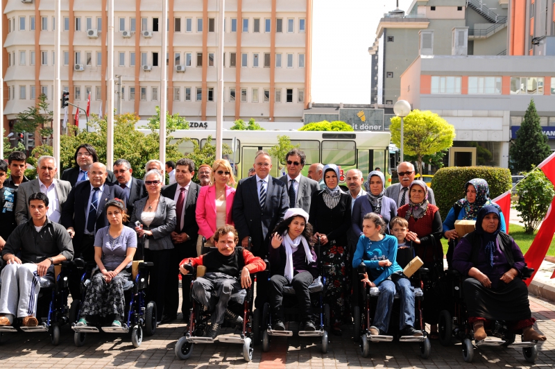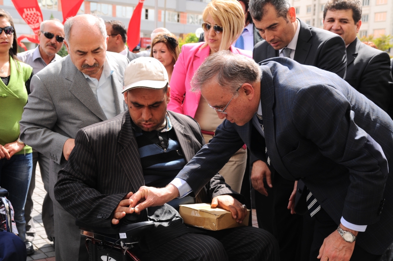 Gaziantep Büyükşehir Belediyesi önünde düzenlenen 10 akülü ve 4 manuel tekerlekli sandalye bağışının yapıldığı törene Gaziantep Valisi Süleyman Kamçı, Büyükşehir Belediye Başkanı Dr. Asım Güzelbey, Frankfurt Gaziantepliler Dernek Başkanı Mehmet Göğüş, Başkan Yardımcısı Ökkeş Toy, Türkiye Sakatlar Derneği Gaziantep Şube Başkanı Hulusi Kalender, engelli vatandaşlar ve aileleri katıldılar.