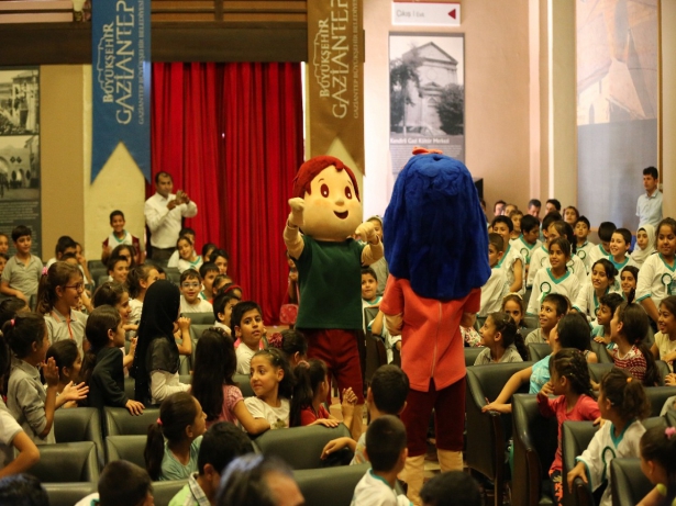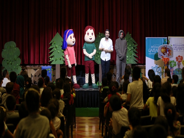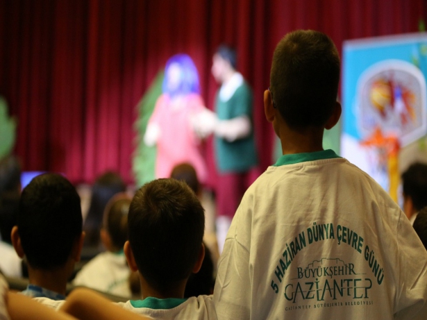 Gaziantep Büyükşehir Belediyesi Çevre Koruma ve Kontrol Daire Başkanlığı organizasyonuyla gerçekleştirilen etkinlikte tiyatro öncesi "çevre bilinci eğitimleri" çerçevesinde hazırlanan çevreci "Toprak ve Su" maskotları çocuklara küçük bir gösteri yaparak, onlarla sohbet etti.