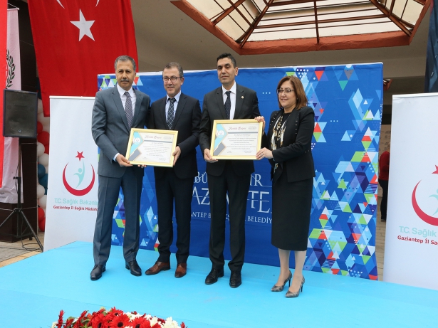 Konuşmaların ardından, merkezin kurulmasına destek veren Gaziantep Ticaret Odası Yönetim Kurulu Başkanı Beyhan Hıdıroğlu ile Organize Sanayi Bölgesi Yönetim Kurulu Başkanı Deniz Köken’e teşekkür belgesi verildi