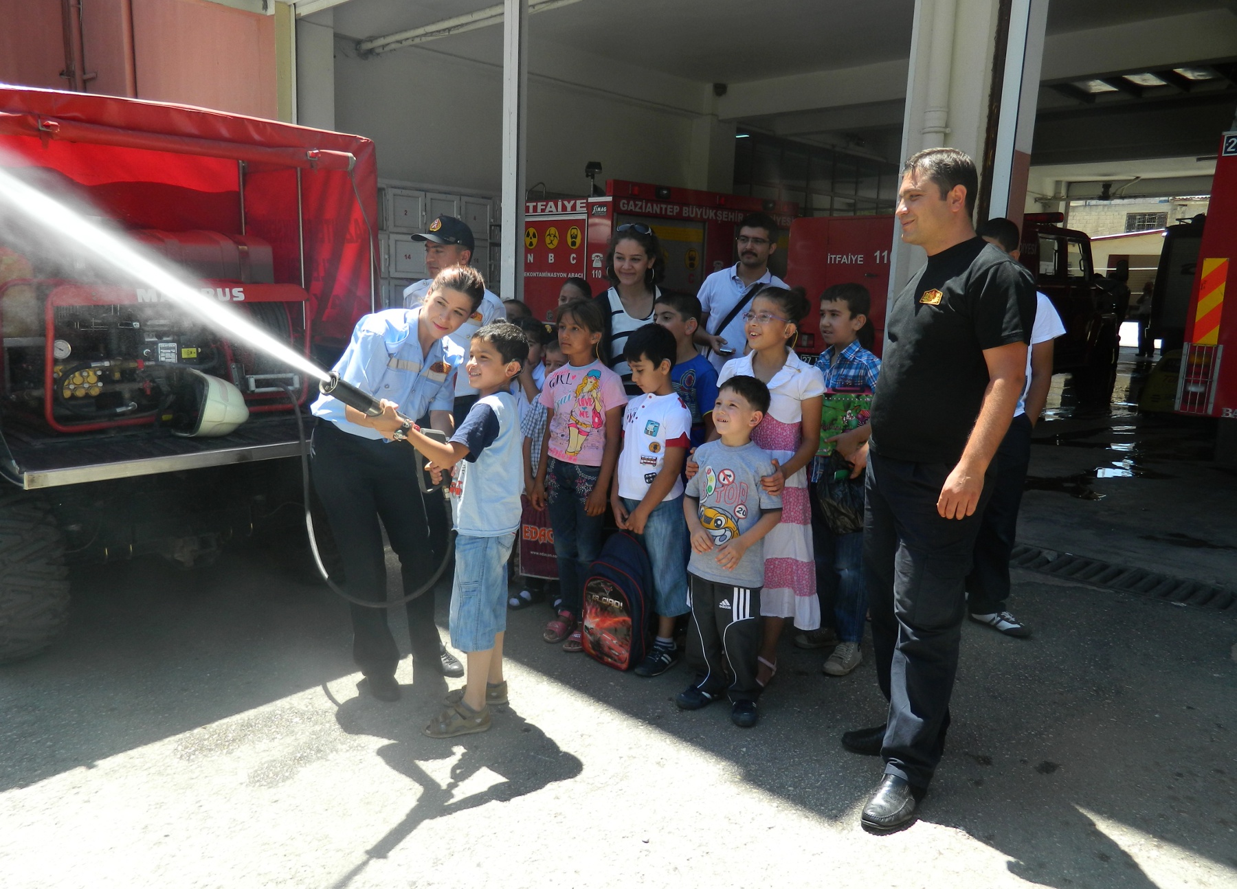 İtfaiyeci kaskı takıp, hortumla su sıkan çocuklar en zor mesleklerden biri olan ve çok sevdikleri itfaiyecilik mesleğini yapmanın mutluluğunu yaşadılar.