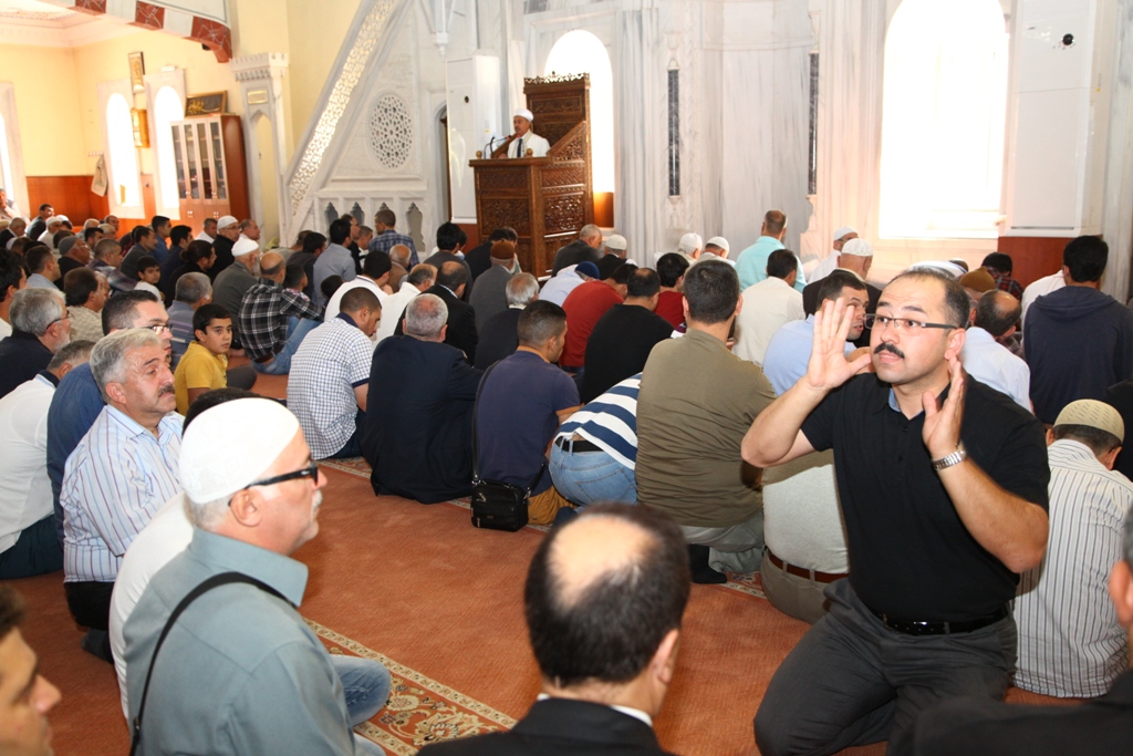 Cemaatin arasında imamın anlattıklarını işitme engellilere işaret dili ile anlatan tercüman, daha sonra imam ile birlikte minbere çıkarak oradan işitme engellilere hutbeyi aktardı.
