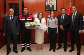 Konuşmaların ardından kadın itfaiyeci Şahin’e çiçek takdim etti.