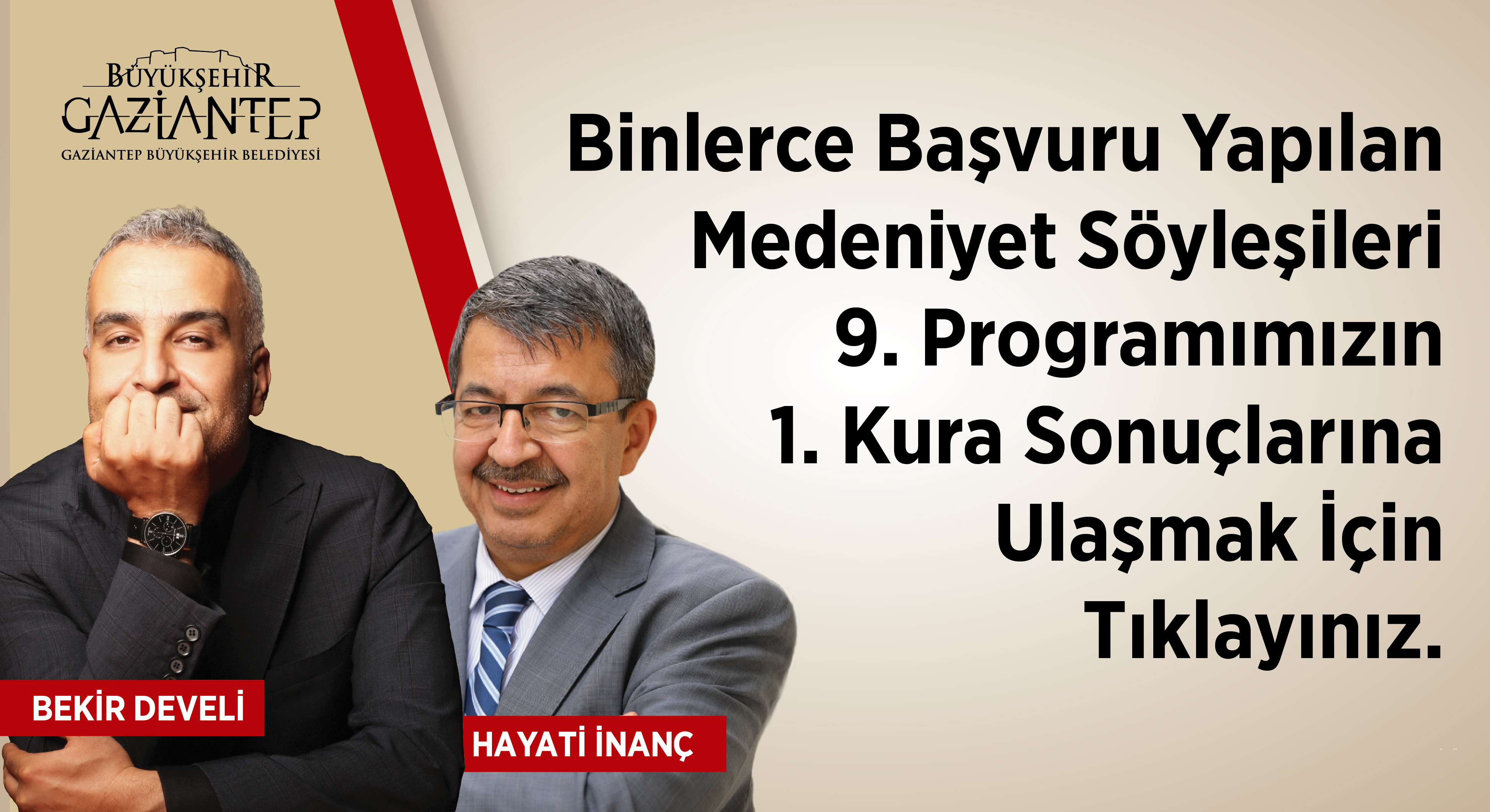 01 Kasım Pazar Günü düzenlenecek olan TV programcısı ve yazar Bekir Develi ve yazar Hayati İnanç’ın konuk olarak katılacağı “Medeniyetimizin Kalbindeki Mümtaz Şahsiyetler” konulu “Medeniyet Söyleşileri” ne katılım sağlamak için toplanan binlerce başvuru arasından yapılan çekilişin 1’nci kura sonuçları belli oldu.