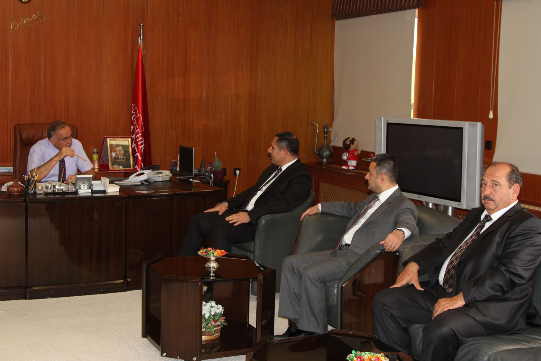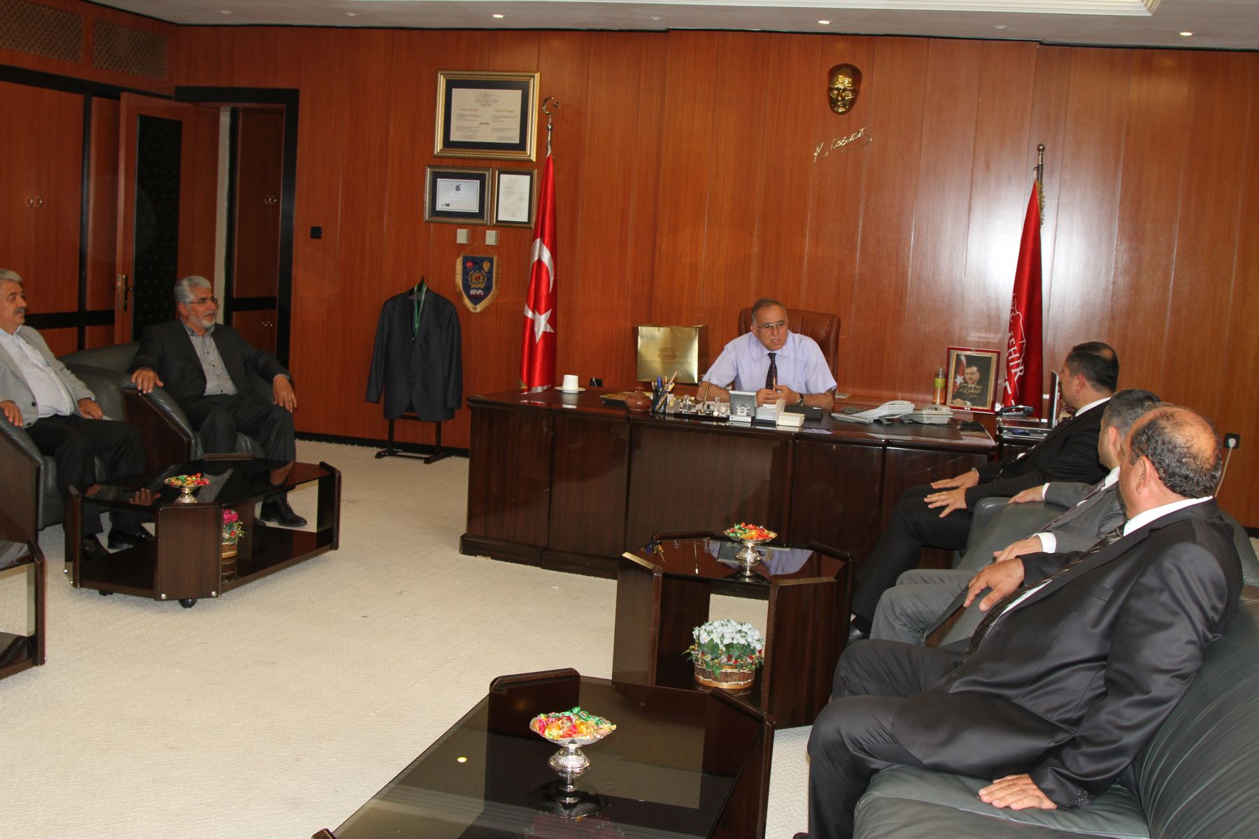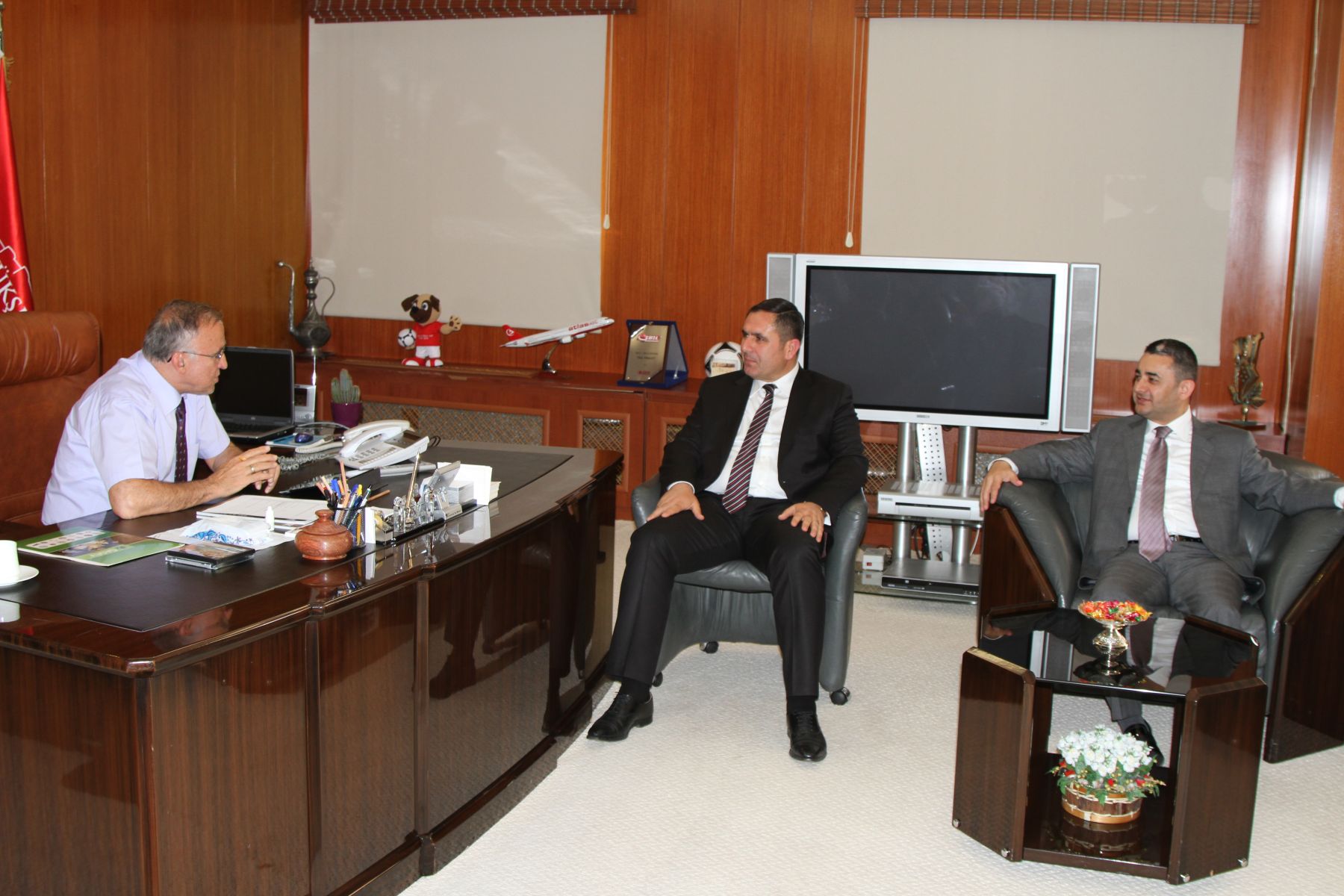 Yeni seçilen Ticaret Borsası Başkanı Ahmet Tiryakioğlu ve Meclis Başkanı Selami Memiş ile meclis üyelerinden oluşan heyet, Başkan Güzelbey ile bir süre sohbet ettiler.