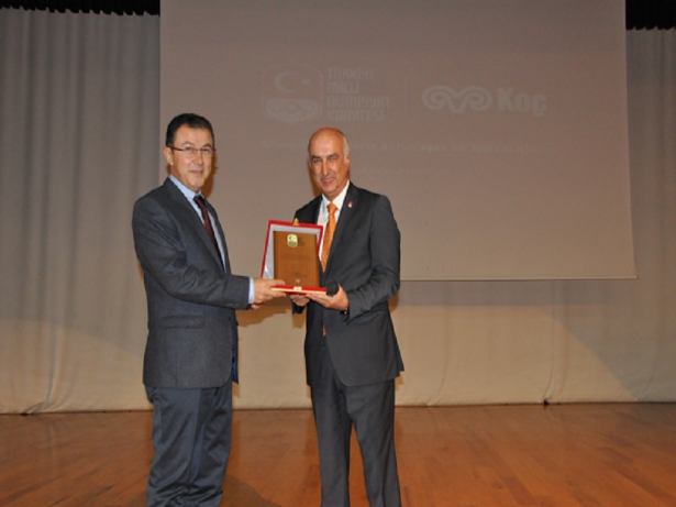 Sunuma katılan Büyükşehir Belediyesi Genel Sekreteri Deniz Köken’e teşekkür plaketini TMOK Genel Sekreter Yardımcısı Bilal Porsun ve Yönetim Kurulu üyesi Oktar Tertemiz verdi.
