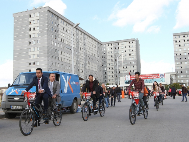 Gaziantep Üniversitesi Ümmü Gülsüm Kız Öğrenci Yurdu’nda kalan kız öğrencileri Büyükşehir Belediyesi Engelliler Dairesi Başkanlığı’nın sağladığı çift kişilik bisikletler ile görme engelli öğrencileri üniversite içinde gezdirdi.