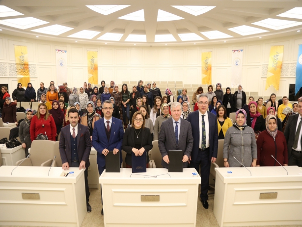 Konuşmaların sonunda Büyükşehir Belediye Başkanı Fatma Şahin, İŞKUR İl Müdürü Siraç Ekin ve İl Milli Eğitim Müdürü Vekili Halit Ateş arasında kurs protokolü imzalandı.