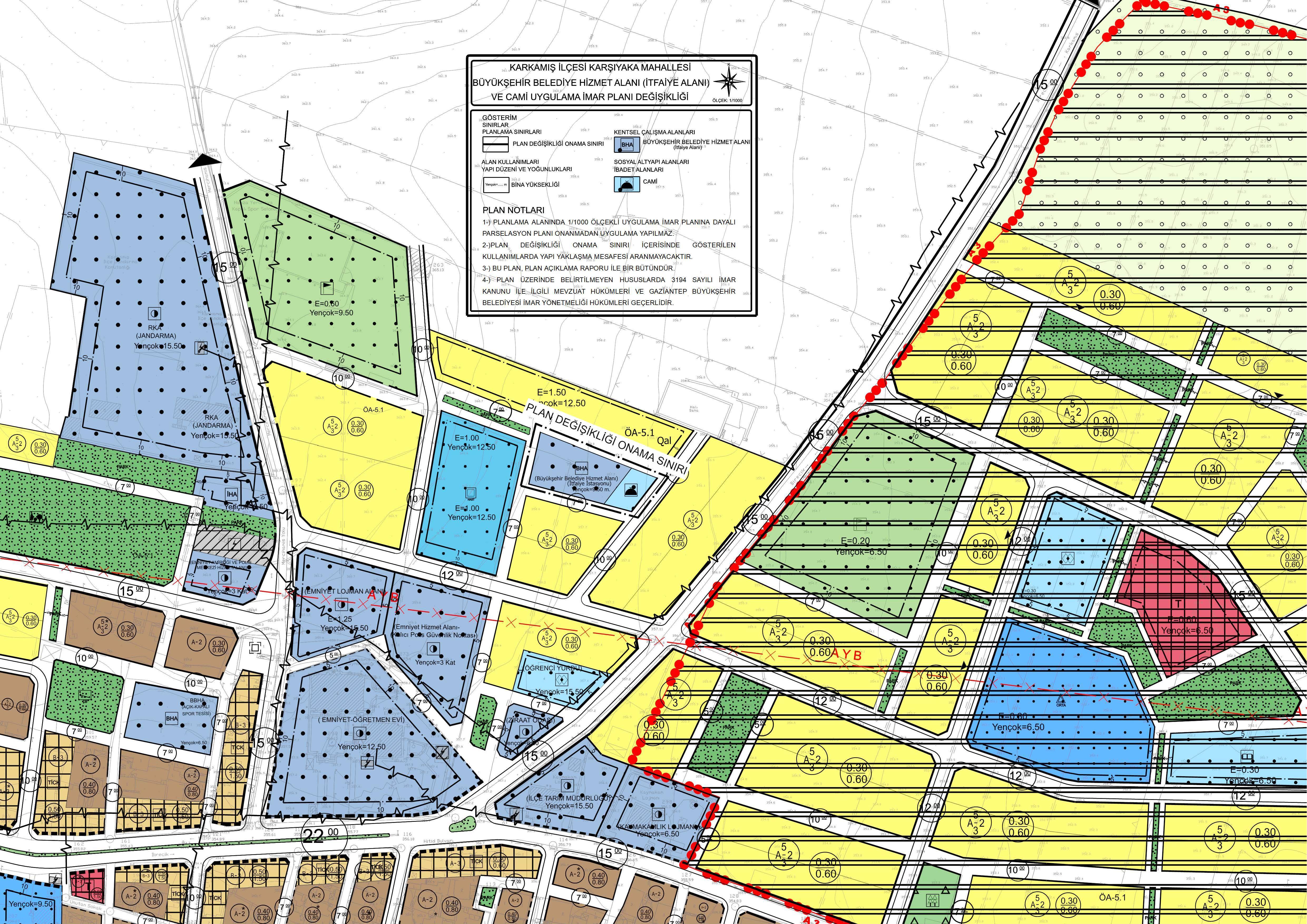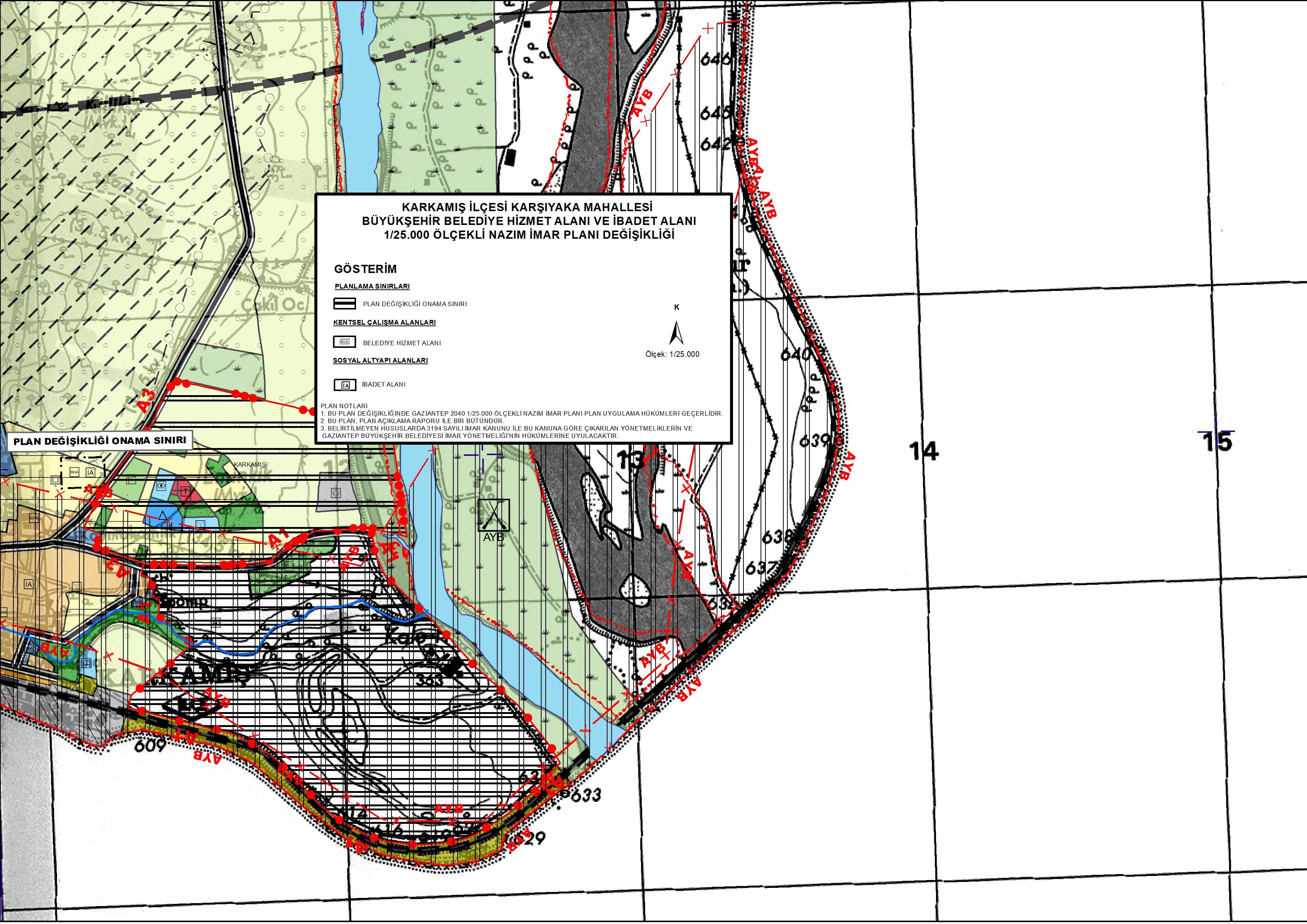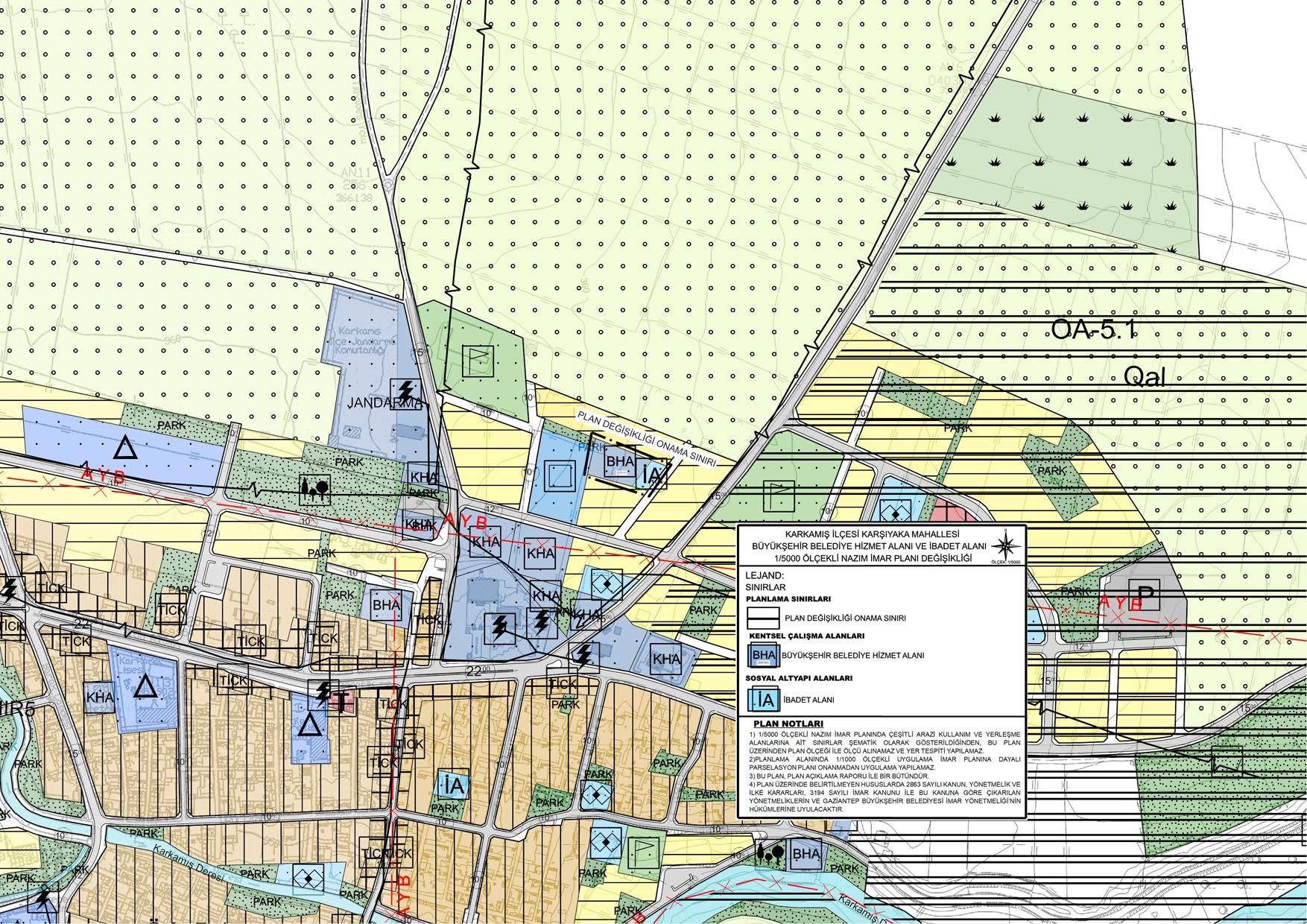 Karkamış İlçesi Karşıyaka Mahallesi O40-A4, O40a-16a nazım ve O40a-16a-1d uygulama imar paftalarında Büyükşehir Belediyesi Hizmet Alanı ve ibadet alanı nazım ve uygulama imar planı değişikliği, Büyükşehir Belediye Meclisinin 12.03.2026 tarih ve 157 sayılı kararı ile uygun görülmüştür.