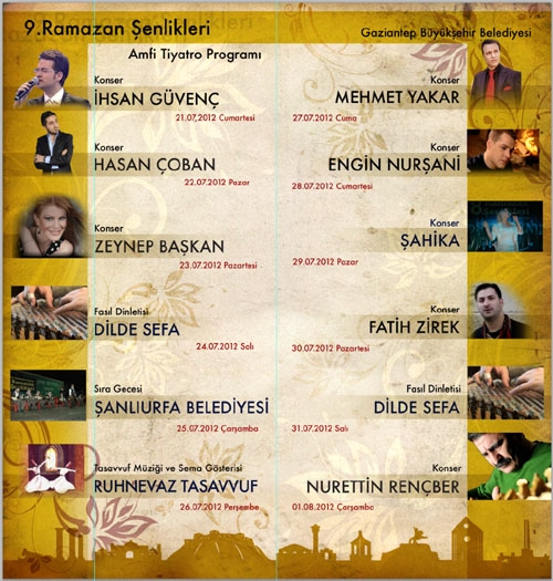 Büyükşehir Belediyesi tarafından geleneksel hale getirilen şenliklerin bu yılki etkinlikleri 21 Temmuz Cumartesi günü TRT sanatçısı İhsan Güvenç konseriyle başlayacak. 100. Yıl Kültür Parkı Amfi Tiyatroda İhsan Güvenç sahne alırken, Masal Parkında Ruhnevaz Tasavvuf Grubu sahne alacak. Şenlikler boyunca her gece hem amfi tiyatro da hem de masal parkında etkinlikler sürecek. İhsan Güvenç konseriyle başlayacak Amfi Tiyatrodaki etkinliklerde sırasıyla Hasan Çoban, Zeynap Başkan, Fasıl Grubu Dilde Sefa, Şanlıurfa Belediyesi sıra gecesi, Ruhnevaz Tasavvuf Grubu, Mehmet Yakar, Engin Nurşani, Şahika, Fatih Zirek, Fasıl Grubu Dilde Sefa, Nurettin Rençber, Ruhnevaz Tasavvuf Grubu, Alleben Grubu Sıra Gecesi, Latif Doğan, Yağmur Ercan, Mehmet Kalkan, Ruhnevaz Tasavvuf Grubu, Haşıl Grubu -Sıra Gecesi, Ruhnevaz Tasavvuf Grubu, Kültür ve Turizm Bakanlığı Konya Türk Tasavvuf Müziği Topluluğu, Grup Laçin, Serap Altınok ve Ahmet Özkan konserleri düzenlenecek.