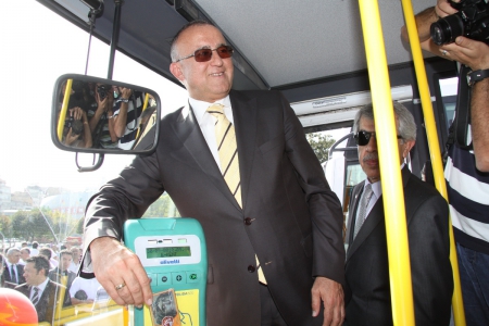 E-Kent Genel Müdürü Vahit Özkan tarafından Başkan Güzelbeye fotoğrafının yer aldığı ilk Akıllı Kartın hediye edilmesinin ardından açılışı yapan Büyükşehir Belediye Başkanı Dr. Asım Güzelbey bu kartı halk otobüsünde Validatörde okutarak Akıllı Kart Sistemini hizmete açtı.