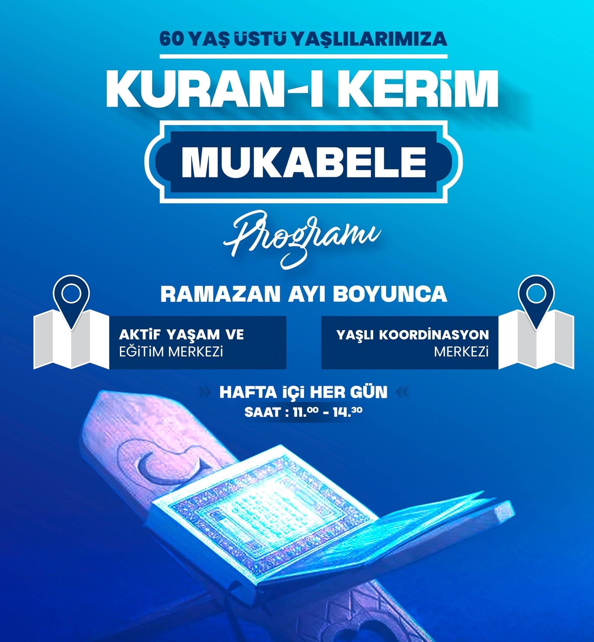 Gaziantep Büyükşehir Belediyesi Aktif Yaşam ve Yaşlı Koordinasyon Eğitim Merkezi’nde Ramazan Mukabele programı düzenleniyor. Ramazan ayı boyunca 60 yaş üstü büyüklere Kur’an-ı Kerim tilaveti eşliğinde merkezde bir araya gelinecek. Saat 11.00- 14.30 saatleri arasında yapılacak program hakkında 0342 321 08 53 irtibat numarasından bilgi alabilecek.