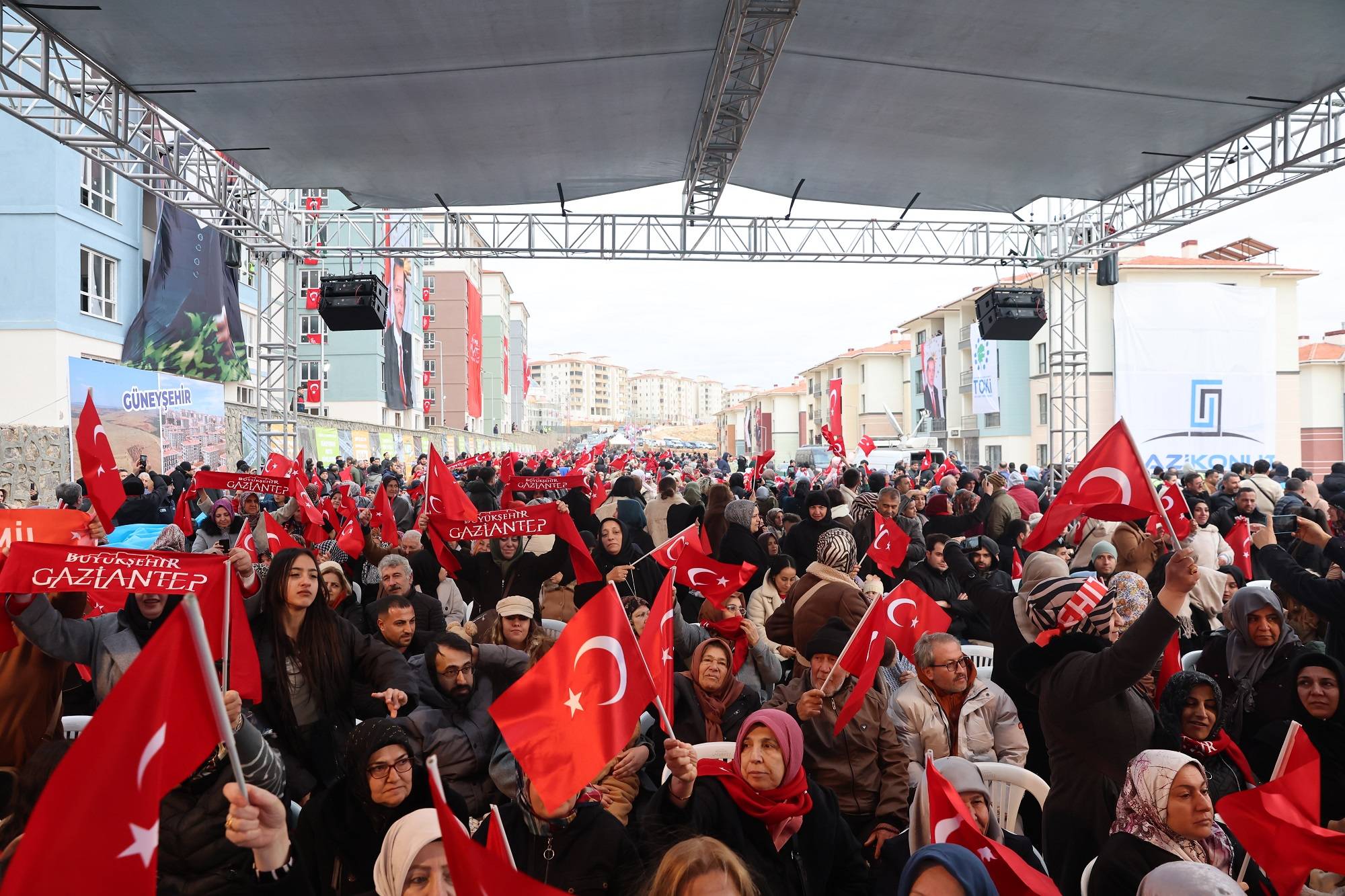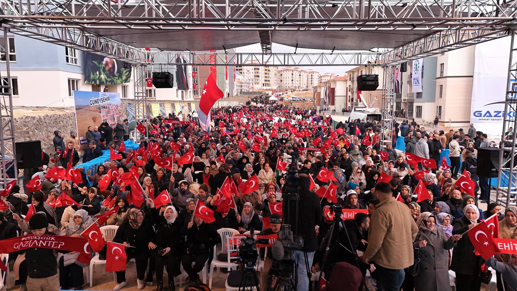 “455 bin konutu teslim ettik. Yeni hastaneler, okullar, yollar, organize sanayiler, küçük sanayi sitelerini inşa ettik. Gaziantep’te 25 bin 237 konut, 4 bin 463 köy evi, bin 353 iş yerini hak sahiplerine teslim ettik. Gaziantep hep söylüyoruz en hızlı toparlanan ilimiz oldu. Bu tesadüf değil. Değerli Büyükşehir Belediye Başkanımızın Gaziantep Modeli dediği hadiseden kaynaklanıyor. Gaziantep Modeli, farklılıklarımız olabilir, farklı düşünebiliriz ama Gaziantep söz konusuyla, Gaziantep’in ortak menfaatleri söz konusuysa hepimiz birlik ve beraberlik içinde hareket ederiz. Bence işin özü bu. Merkezi idare, yerel yönetim, iş dünyası, sivil toplum, meslek kuruluşları, üniversiteler, hepsi aynı hedefe kilitleniyor. Gaziantep bir kalkınma, gelişme modeli. Gaziantep’i bu yönleriyle çok takdir ediyoruz. Bir taraftan büyük bir medeniyet şehri. Aynı zamanda da modern dünyaya hızlı adapte olan, görüntüde değil, gerçek anlamda üretimiyle, girişimciliğiyle, ihracatıyla, dışa açık sanayisiyle, bütün bunlarla hızlı bir şekilde kalkınan, gelişen bir ilimiz. Gaziantep ve Gazianteplilerle iftihar ediyoruz. Gaziantep’i bir örnek olarak anlatmamız lazım.”