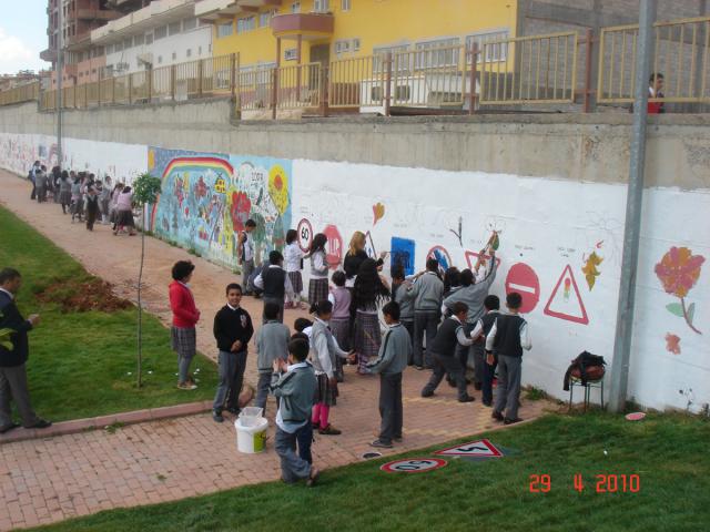 Gaziantep Büyükşehir Belediyesi Öğrenen Organizasyonlar Değişim Takımı Türkiye Eğitim Gönüllüleri Derneği işbirliği ile Umut İlköğretim Okulu öğrencilerine trafik eğitimi vererek trafik işaretleri temalı duvar boyama çalışması yaptılar.