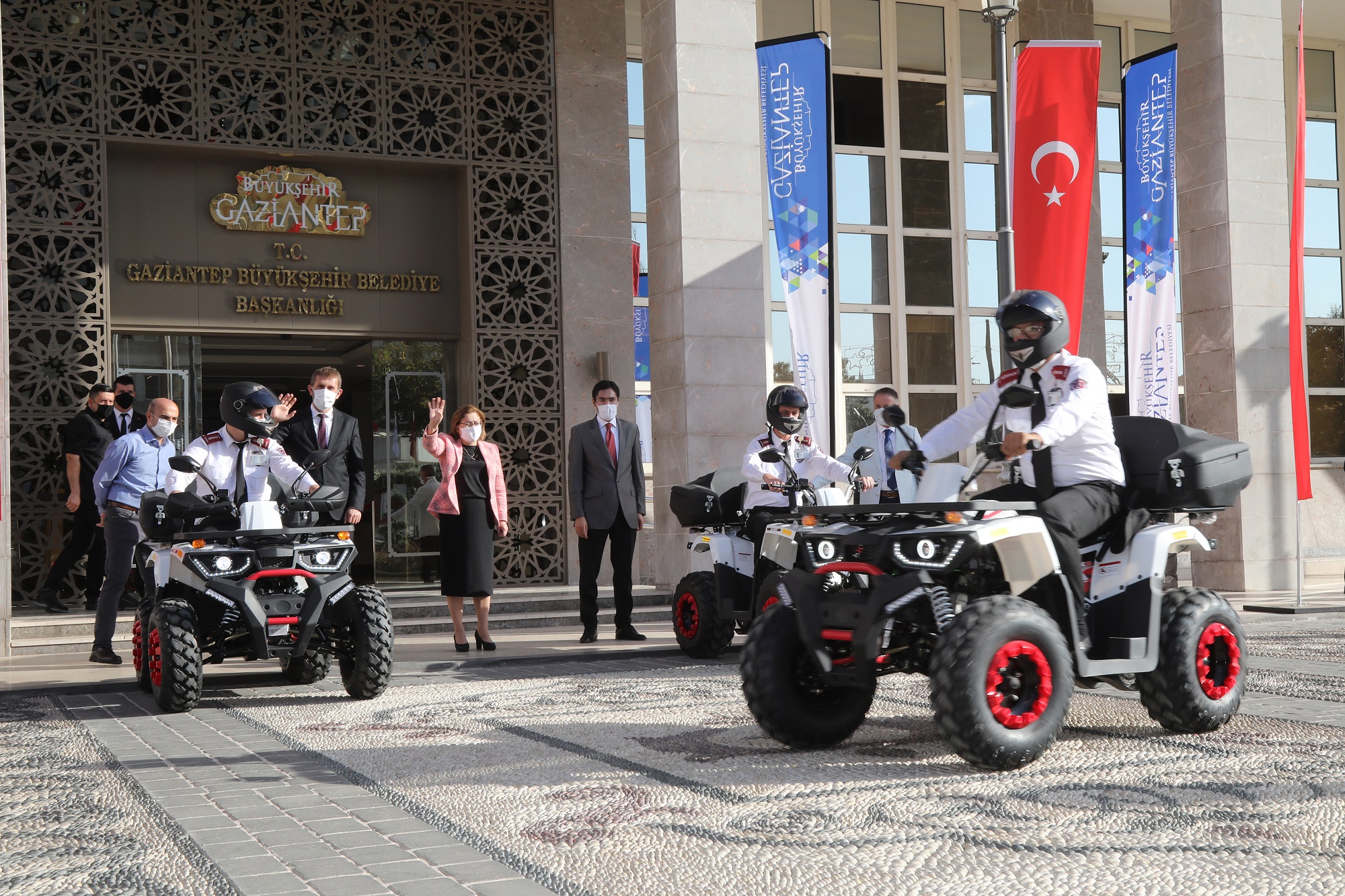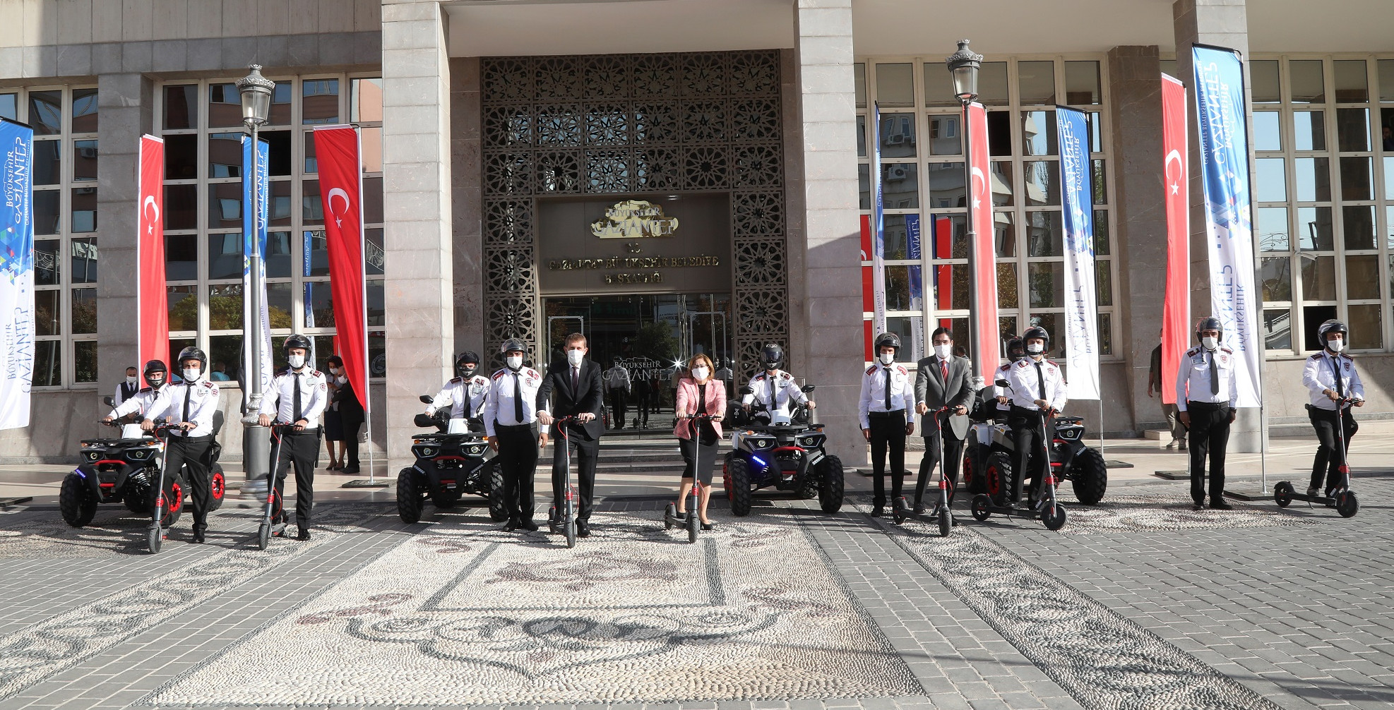 Gaziantep Büyükşehir Belediyesi, dijital ve teknolojik hizmet ağının şehirdeki etki alanını genişletmek için başlattığı Türkiye’de bir ilk olan yerli ve milli Güvenli Park Projesi ile olayların tespit hızı saniyelere düşürülürken müdahalede de aynı hızı yakalamak için harekete geçti. Bu kapsamda halkın yoğun şekilde kullandığı kent ormanları ve mesire alanlarında çalışan devriye ve özel güvenlik görevlilerinin coğrafik nedenlerle karşılaştıkları zorlukları bertaraf etmek, parklarda hareket ve hız kazanmak amacıyla ekiplere yeni araç desteklerinde bulunuldu. Büyükşehir Belediyesi Destek Hizmetleri Daire Başkanlığı tarafından 8 adet elektrikli scooter ve 4 adet ATV motosikleti ilk etapta kullanıma sunuldu. Gaziantep Büyükşehir Belediye Başkanı Fatma Şahin’in katılımıyla belediye binası önünde düzenlenen törenle yeni araçlarını alan güvenlik personelleri sorumlu oldukları alanlarda göreve başladı.