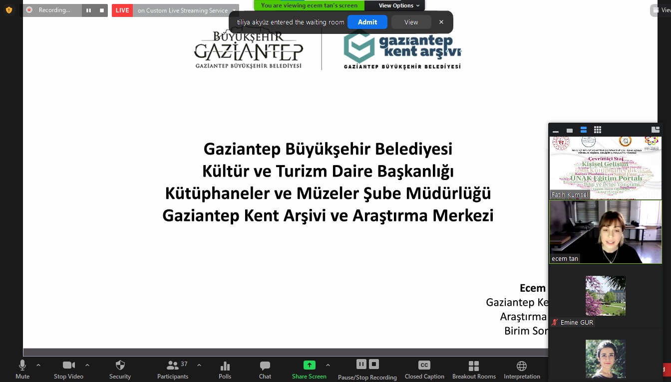 Geçmiş ile gelecek arasında bir köprü görevi gören, kentin hafızası olan Büyükşehir Belediyesi Kültür ve Turizm Daire Başkanlığı’na bağlı Kent Arşivi, modern çalışmaları ile ön plana çıkıyor. Üniversite ve Araştırma Kütüphanecileri Derneği (ÜNAK) ile Türk Kütüphaneciler Derneği (TKD) iş birliğinde Gençlik ve Spor Bakanlığı Gençlik Projeleri Destek Programı kapsamında Türkiye’de ki iyi kütüphane ve arşiv örneği kurumlarıyla yapılan staj programı olan “Bilgi ve Belge Yönetimi Öğrencileri Çevrimiçi Staj Projesi”, İstanbul Medeniyet Üniversitesi Bilgi ve Belge Yönetimi bölümü öğrencileriyle gerçekleşti. Yeni tip Koronavirüs (Kovid-19) Salgını nedeniyle video konferansla gerçekleşen programda Gaziantep Kent Arşivi, Türkiye geneli iyi örnek olarak öğrencilere gösterildi. Programda katılan 80 öğrenciye, Kent Arşivi yetkilileri çevrimiçi yapılan eğitimlerle staj eğitimi verdi.