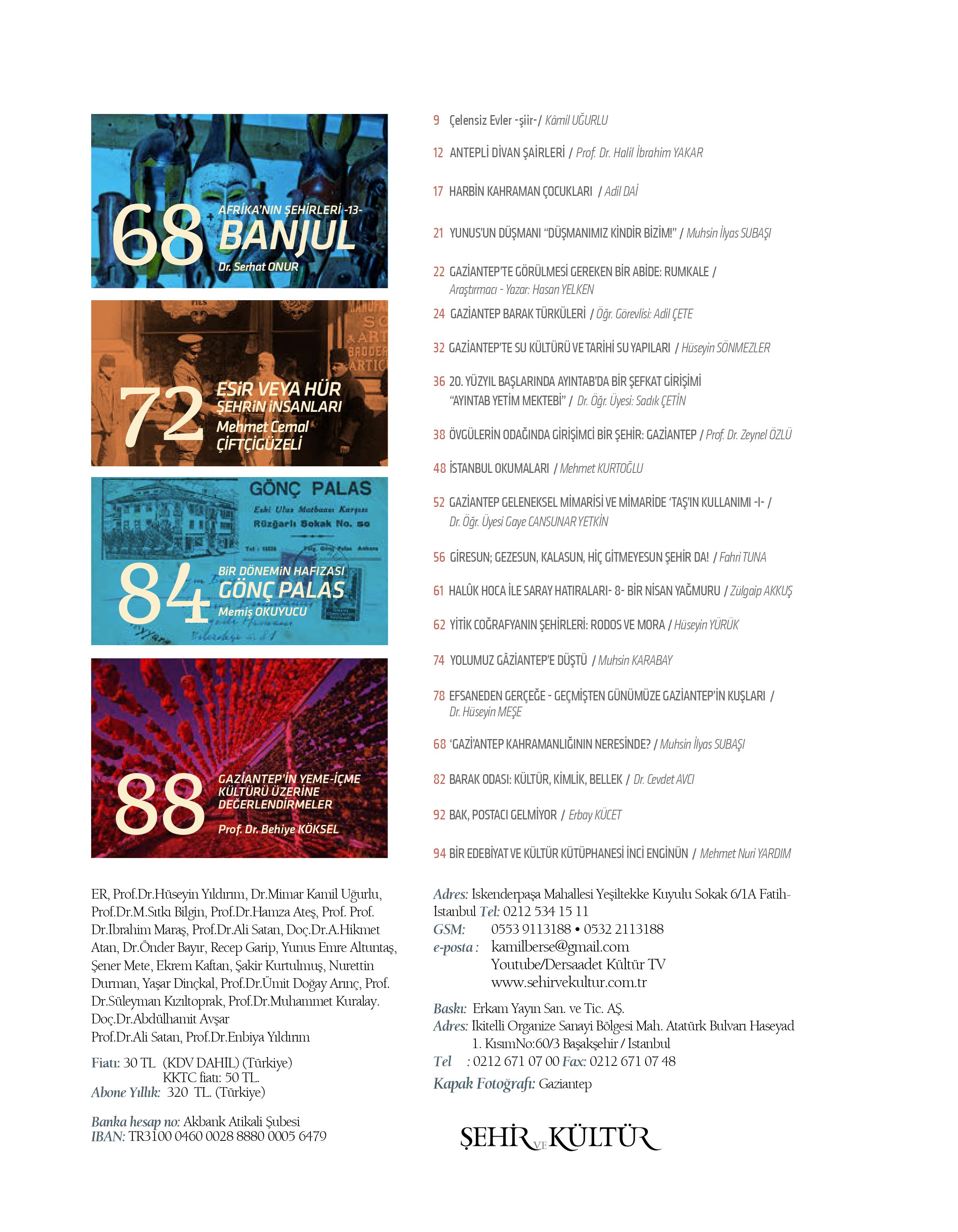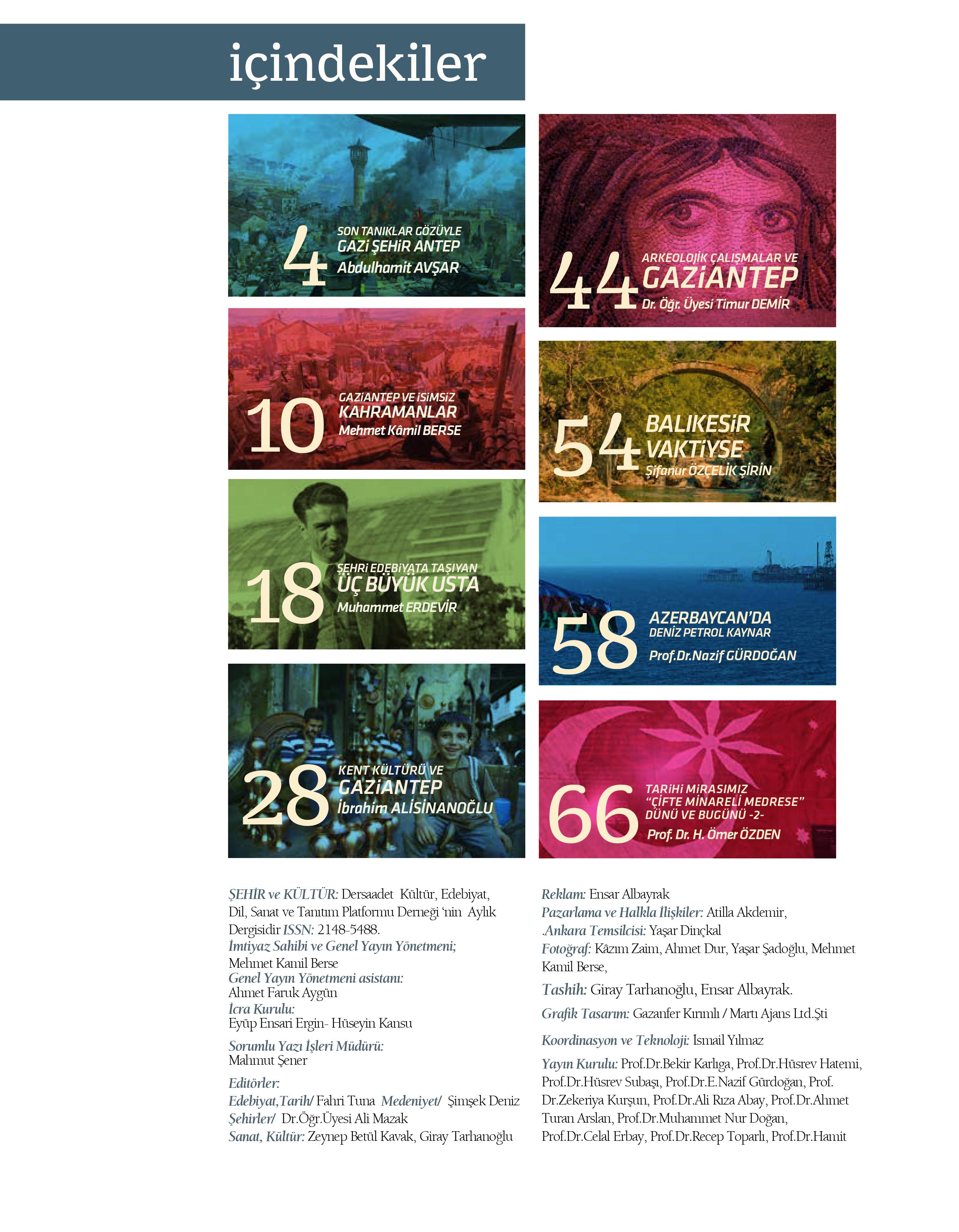 Derginin bu sayısında, “Son Tanıklar Gözüyle Gazi Şehir Antep”, Antepli Divan Şairleri”, “Gaziantep ve İsimsiz Kahramanlar”, “Kent Kültürü ve Gaziantep”, “Gaziantep Barak Türküleri”, “Barak Odası: Kültür, Kimlik, Bellek”, “Gaziantep’te Su Kültürü ve Tarihi Su Yapıları”, “Övgülerin Odağında Girişimci Bir Şehir: Gaziantep”, “Gaziantep Geleneksel Mimarisi ve Mimaride Taşın Kullanımı”, “Yolumuz Gaziantep’e Düştü” ve daha birçok başlıklı yazılarla Gaziantep’in tarihi, milli mücadele süreci, kültürü, sanat anlayışı ve coğrafi mirasına ışık tutuluyor.